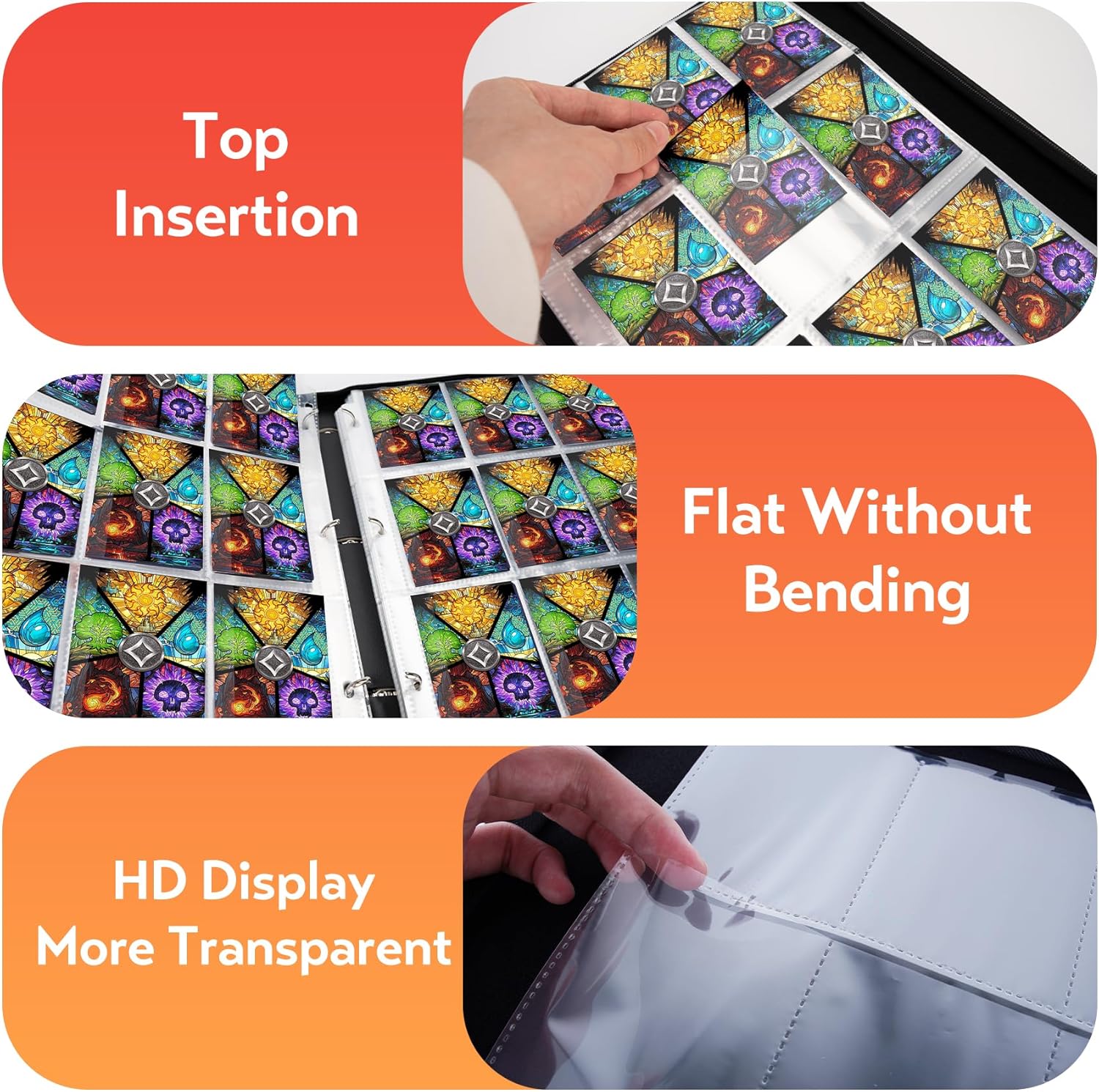 - Function : -Trading Card Binder can not only protect and organize cards, waterproof, scratch-proof, dust-proof, and anti-lost. Advanced reinforced heat-sealed seams technology for trading card binder 9 pocket, flipping through the pages like a book will different with regular MTG binder, even no rings to mess up cards. The side loading pockets also means no cards falling out if you hold the photocard collector upside down