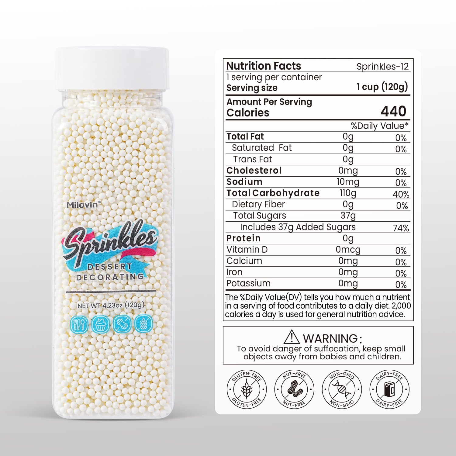 - White Nonpareils Sprinkles: A bottle of edible nonpareils sprinkles(120g/4.23oz), whether it's cakes, cupcakes, cookies, ice cream, cake pops, brownies, or any dessert you can dream of; our white sprinkles are your go-to for that extra dash