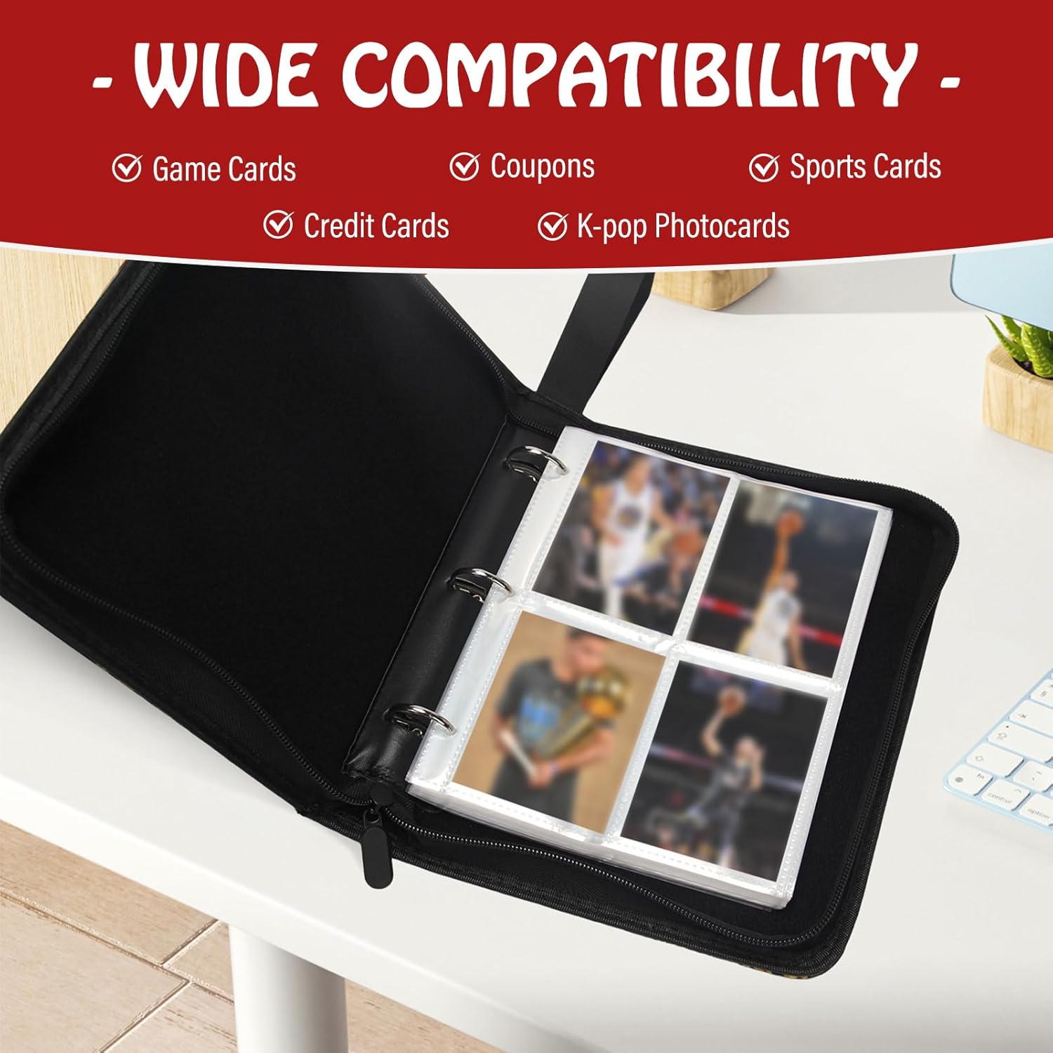 - Unique Design:Open the creative card holder along the zipper direction, select the card you want to collect, and gently insert it into the card slot. The flexible 3-ring design allows you easily to insert and remove the pages,the clear and transparent card slot allows you to see every detail of the cards without taking out