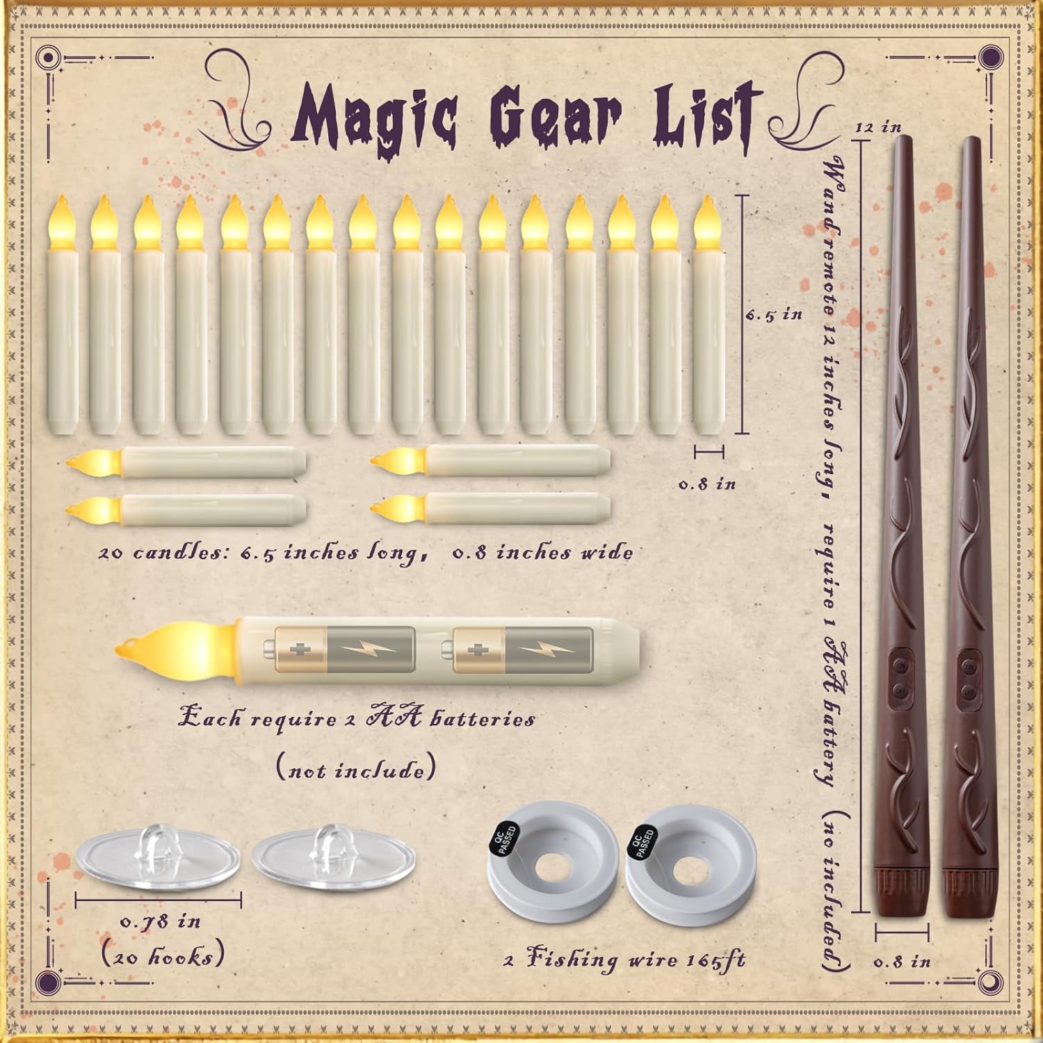- Never received a letter from magic school? but it doesn't matter! You will receive 20 pcs hanging floating candles, an easy hanging kit with 2 wand remote range of 45 ft/10 meters which can switch these flickering flameless taper candles on and off simultaneously just like magic. Set these candles in your house, and with just one click, together with some spells and movements, you are a witch!