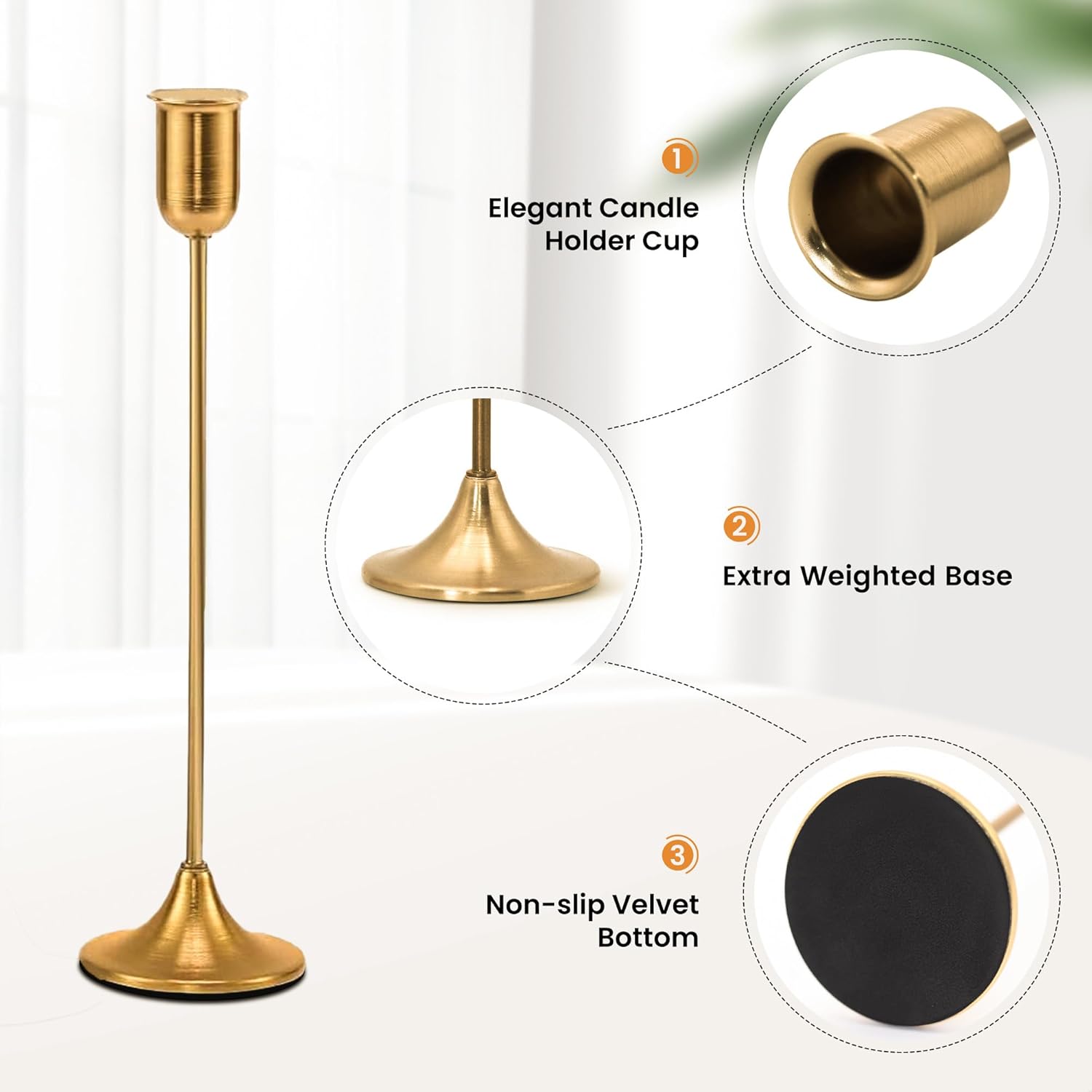 - ✅ Elegant 6-Piece Set: Set of 6 gold taper candle holders made from durable matte metal, designed to hold standard taper candles. Perfect for adding a modern, elegant touch to dining tables, mantels, coffee tables, weddings, dinner parties, or home decor settings. This gold candle holders set is suitable for candle sticks and taper candles, each one can fit 3/4 inch and 7/8 inch small candles as well as LED cone candles to match your dining table decor.