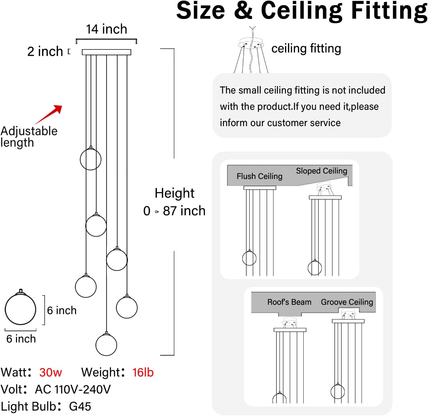 - 【Glass Chandelier Size】Chandelier ceiling plate diameter: 14 inch, Chandelier max height: 87inch.Crystal size:W 6inch * H 6inch,The chandelier weighs about 16LB