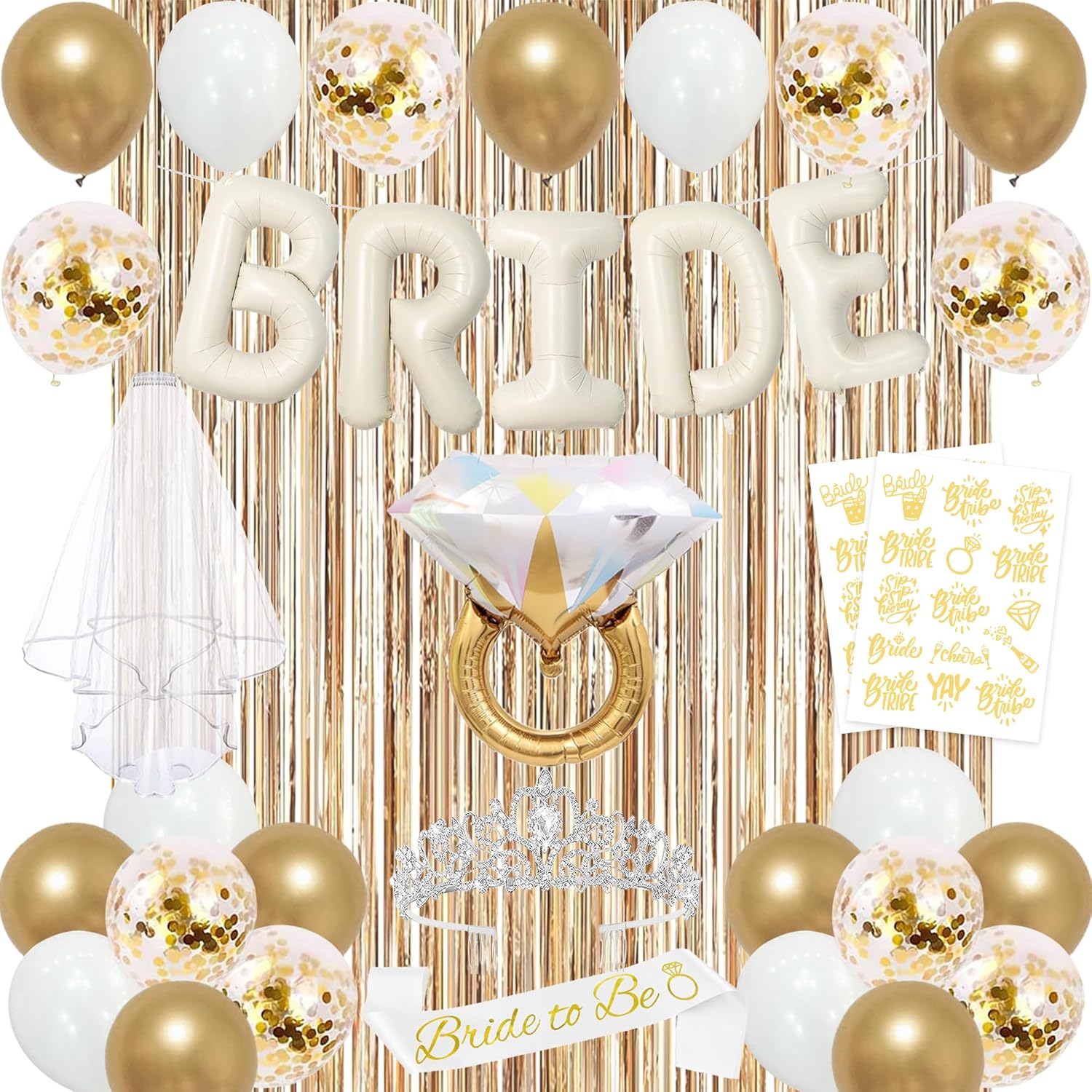 - [Bride to Be Decorations Set] Package Included:1pc champagne gold "bride to be" banner, bridal shower crown,1pc ring foil balloon, 14pcs balloons, 2pcs Fringe Curtains, 2pcs bride to be themed tattoo sticker,the bachelorette party sash "bride to be" is made of premium satin and the white veil is made of soft tulle, with a double layer design and edge cascading.