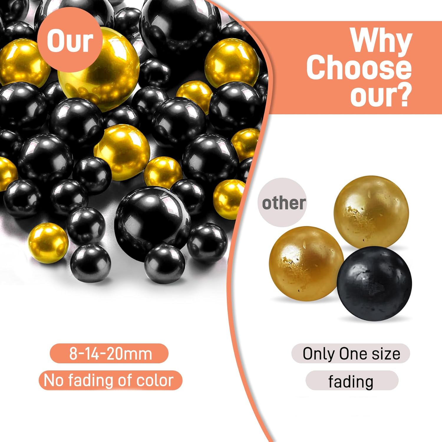 120 PCS 8/14/20mm No Hole Polish Pearl Beads for Centerpiece, Black Gold Beads Decorative Vase Fillers, Plastics Pearls for Vases, Table Scatters, Wedding Party Decor