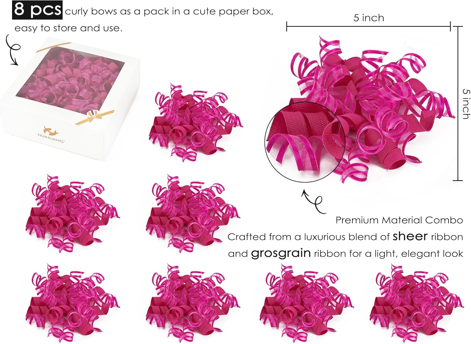 - SIZE & PACK: Each package contains 8 pcs hot pink curly bows, and made from 12 strands of 3/8" wide grosgrain and sheer satin ribbon that adds a airy, elegance and luxurious feel to any gift or decoration. Bows measures 5"~5.5" wide