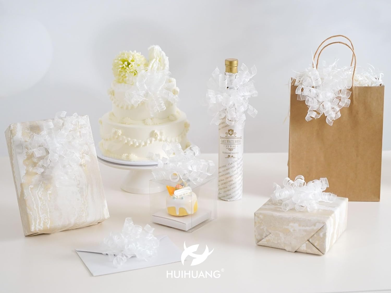 - SIZE & PACK: Each package contains 8 pcs white curly bows, and made from 12 strands of 3/8"(9mm) wide sheer ribbon that adds a light, airy, and luxurious feel to any gift or decoration. Bows measures 5"~5.5" wide, create a dramatic and burst effect, making it ideal for large gift boxes, baskets, and decorations