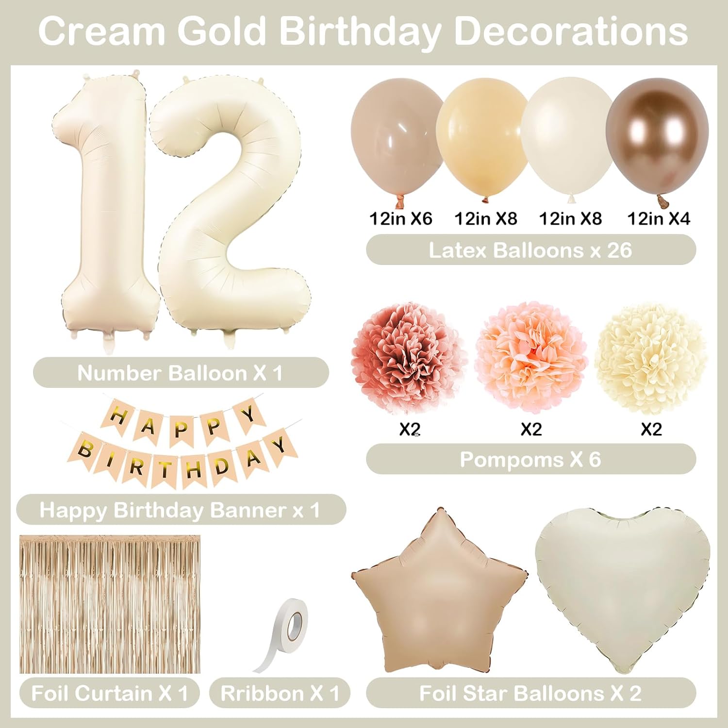 - PACKAGE INCLUDES: 1pc beige 12 number balloon, 1pc happy birthday banner, 2pcs dusty pink paper pom poms, 2pcs blush paper pom poms, 2pcs nude paper pom poms, 1pc champagne gold fringe curtain, 1pc caramel star foil balloons, 1pc cream heart foil balloons, 8pcs nude balloons, 6pcs blush balloons, 8pcs beige balloons, 4pcs champagne gold balloons, 1pc ribbon