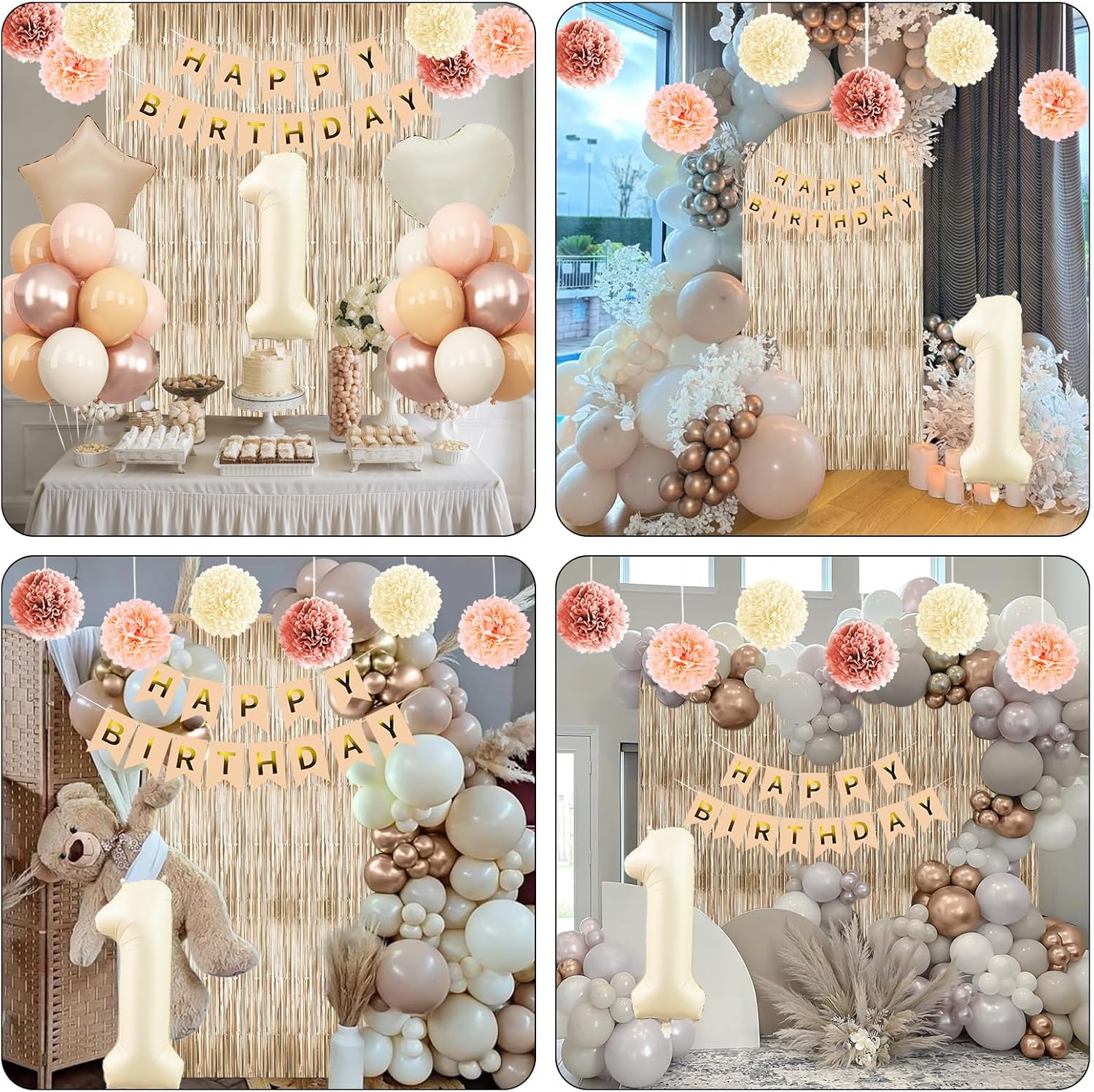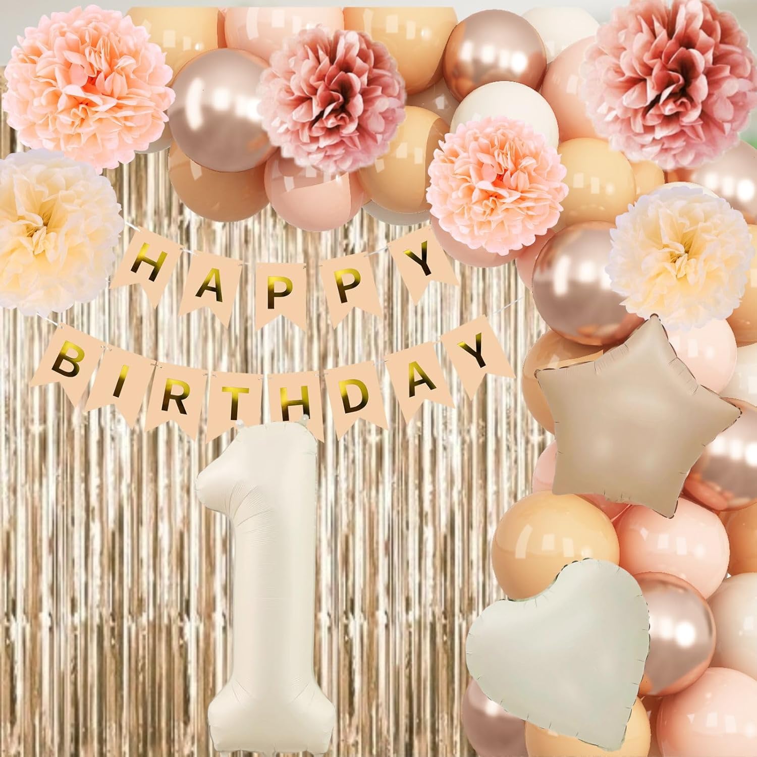 - PACKAGE INCLUDES: 1pc beige 1 number balloon, 1pc happy birthday banner, 2pcs dusty pink paper pom poms, 2pcs blush paper pom poms, 2pcs nude paper pom poms, 1pc champagne gold fringe curtain, 1pc caramel star foil balloons, 1pc cream heart foil balloons, 8pcs nude balloons, 6pcs blush balloons, 8pcs beige balloons, 4pcs champagne gold balloons, 1pc ribbon