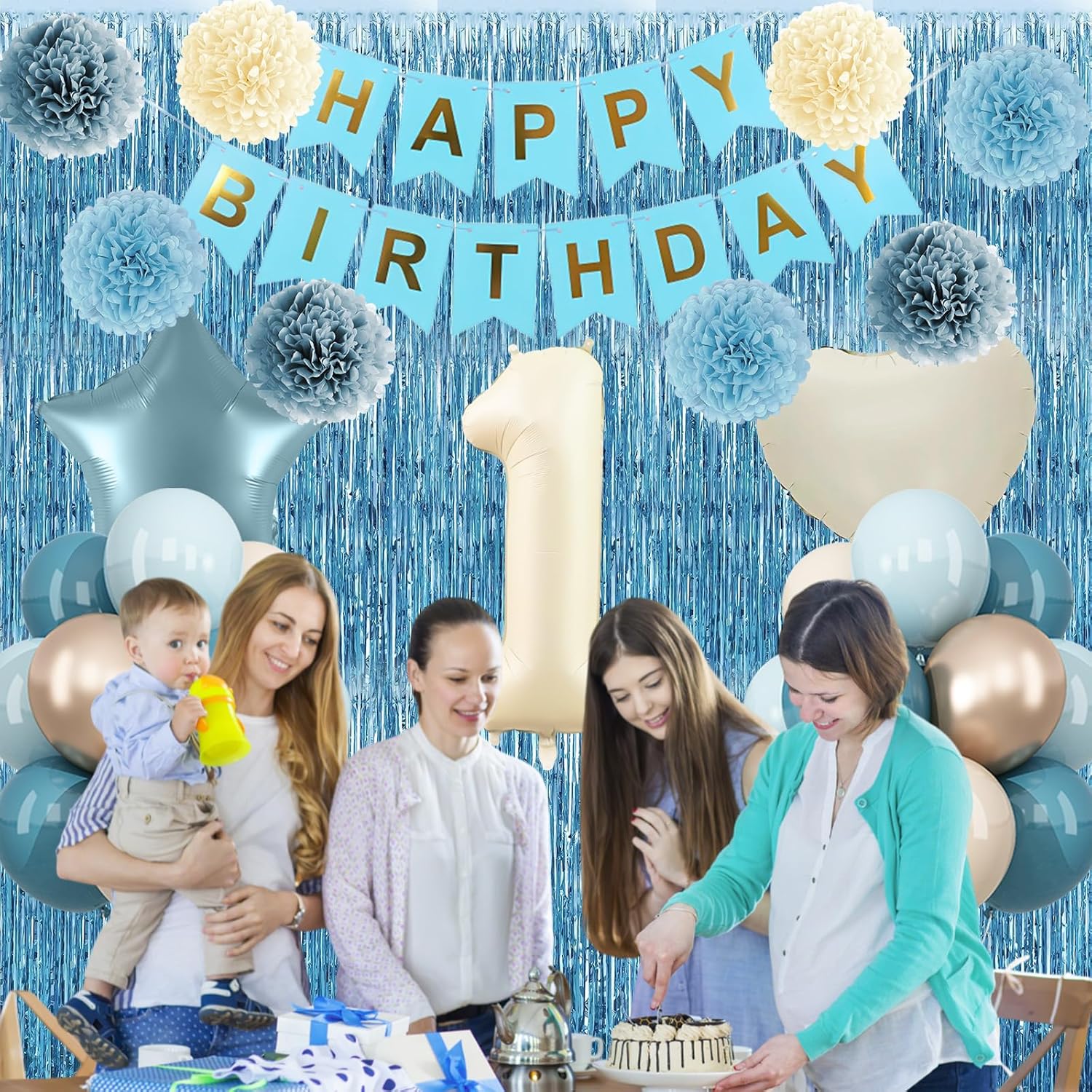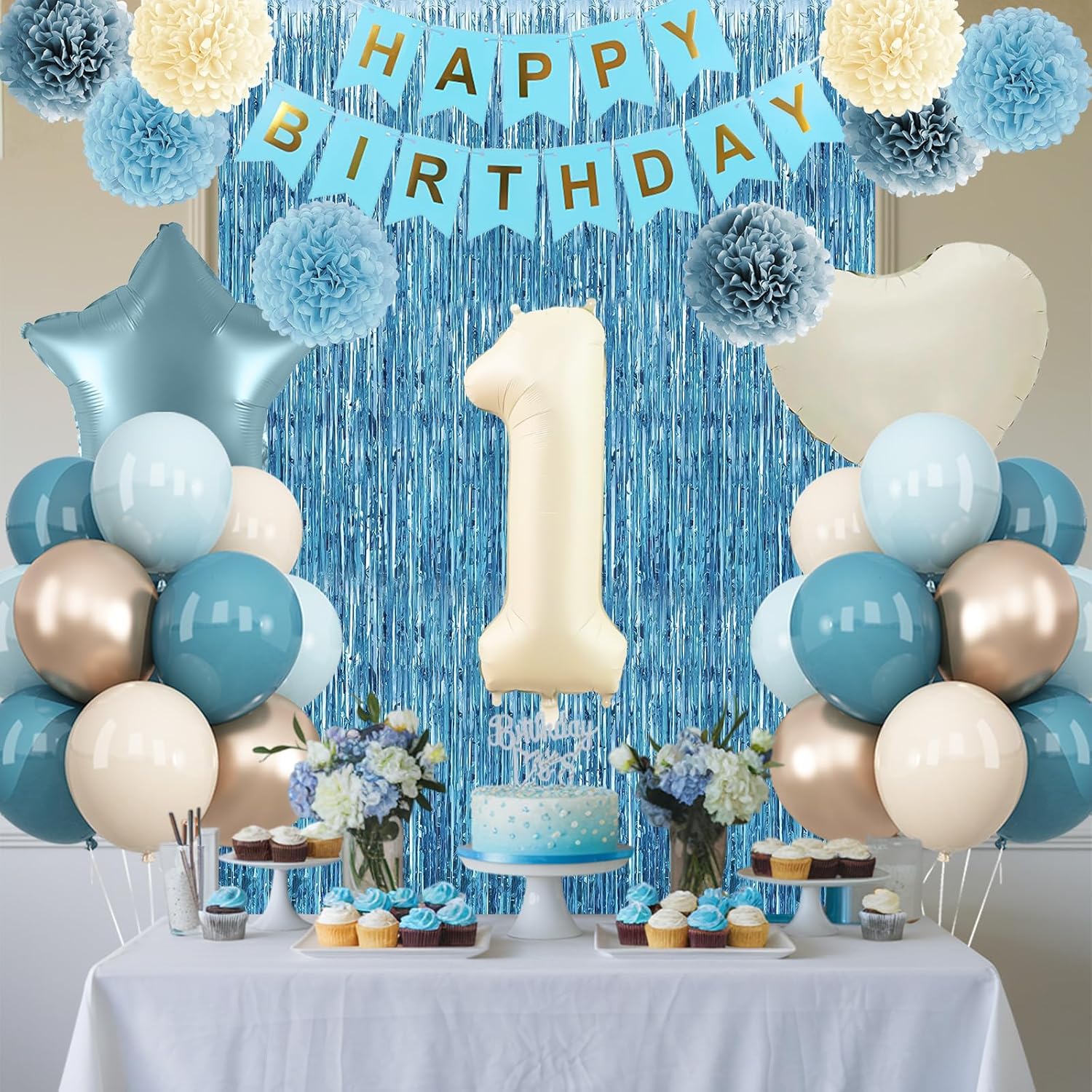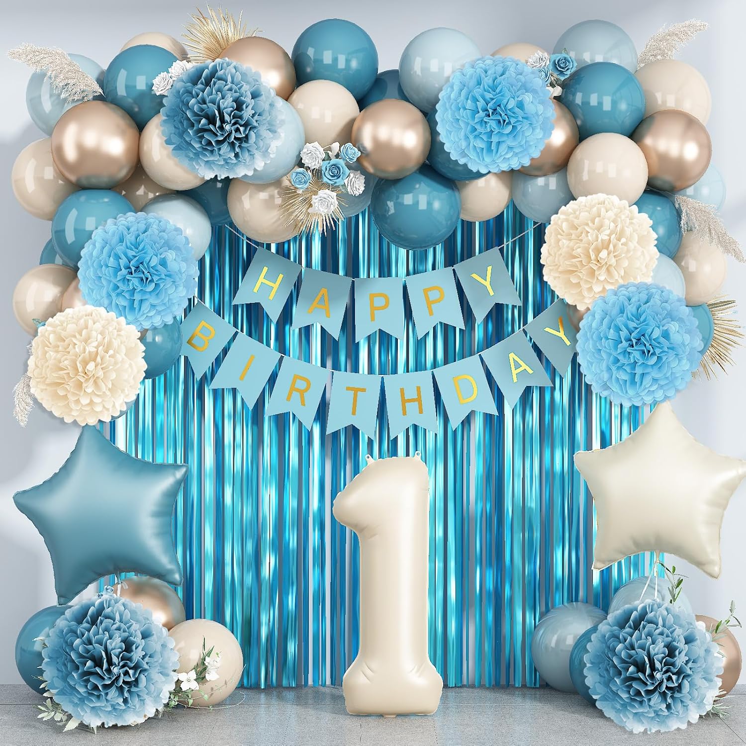 - ALL-IN-ONE DECORATION: Comes with a “1” foil number balloon, includes everything you need: birthday banner, fringe curtain, blue beige gold balloons, star foil balloons, paper pom poms, and ribbon, ideal for first birthdays, baby showers, milestone moments, photo shoots, and family gatherings, suits both indoor and outdoor setups