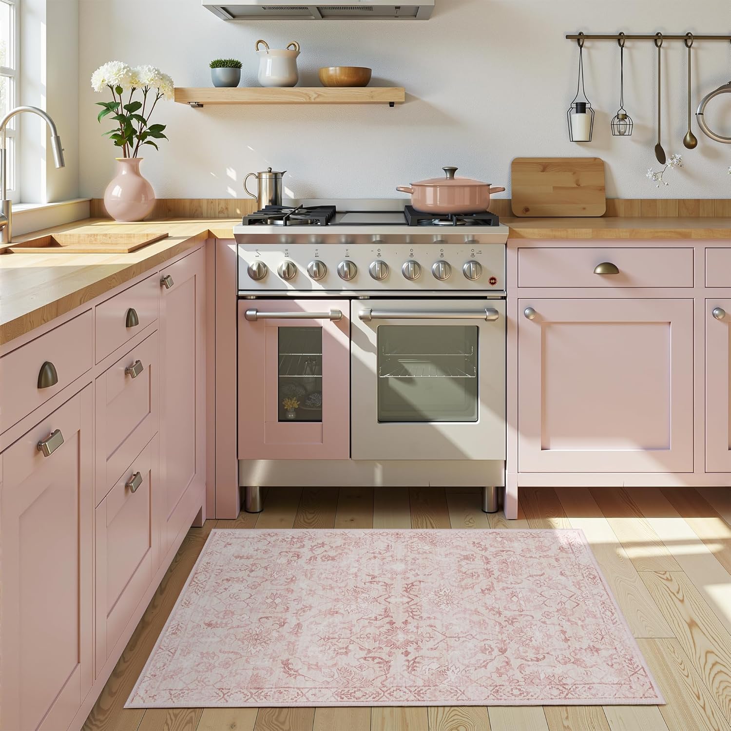 Pink Area Rug 2x3 Entryway Rug for Bedroom Bathroom, Non-Slip Low-Pile Washable Distressed Boho Carpet Retro Accent Doormat for Laundry Room Hallway Kitchen 24x36 Inch