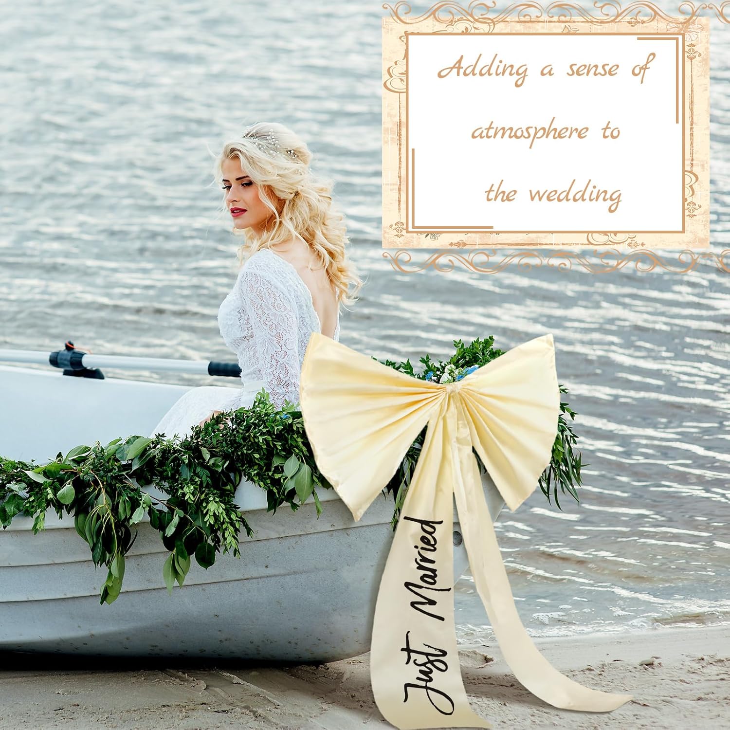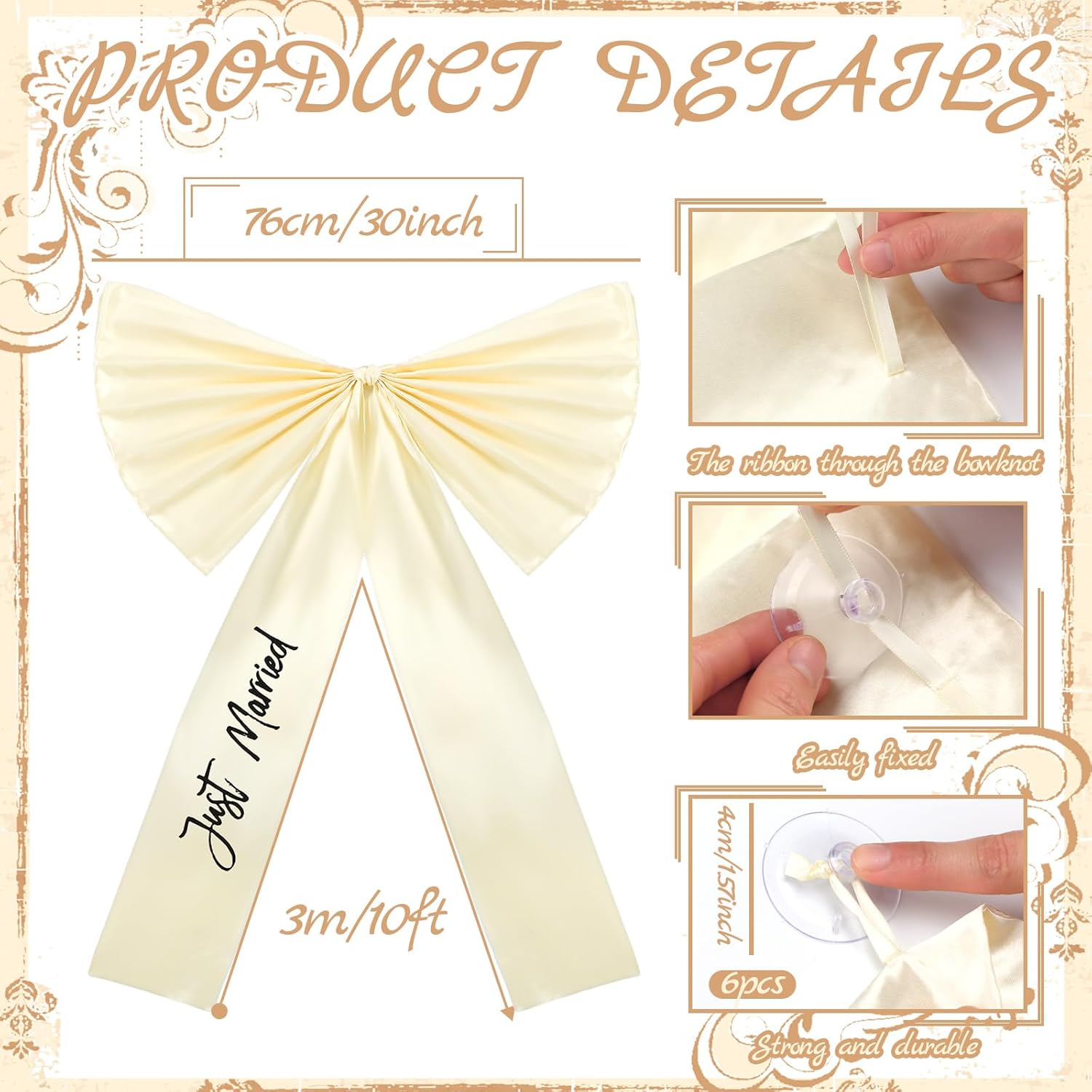- Designed for Weddings: wedding big bow decoration, the words "Just married" are printed on the ribbon, Turn your car into a symbol of love, the creamy white bow with black text can be adapted to most wedding themes, adding a sense of atmosphere to the wedding; Use this exclusive wedding car decoration kit to decorate your vehicle at the wedding for an unforgettable wedding celebration