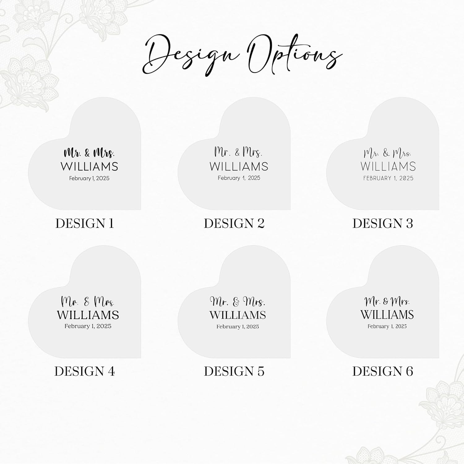 - Personalized Cake Topper: Add a unique touch to your wedding day by customizing this heart-shaped acrylic block with the bride and groom’s names. Choose from 6 elegant designs and 7 colors to perfectly match your wedding theme and style.