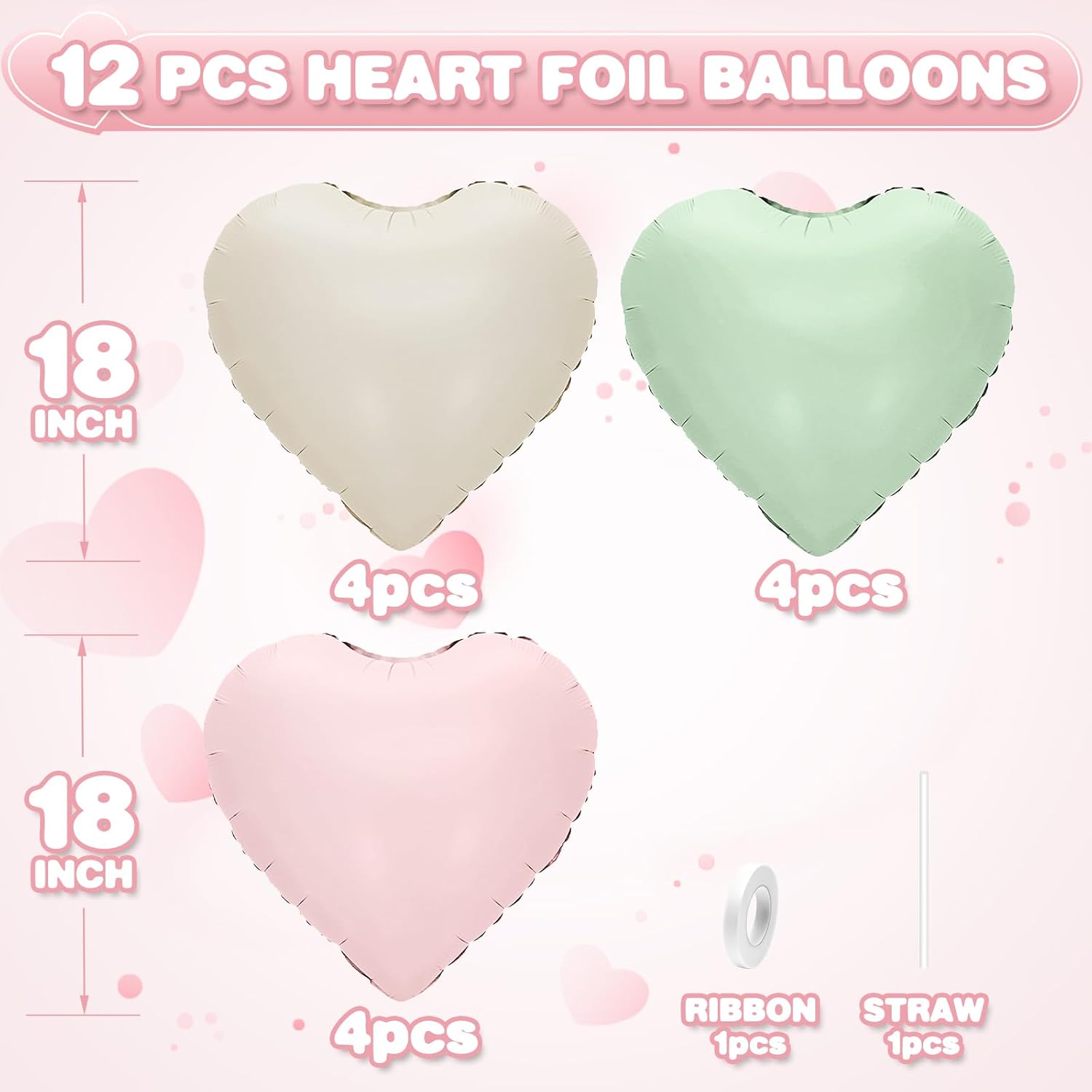 - 12PCS HEART BALLOONS:Package include 4pcs cream white heart foil balloons,4pcs baby pink heart foil balloons,4pcs olive green heart foil balloons,1pc straw.Large enough to help you better decorate your party.
