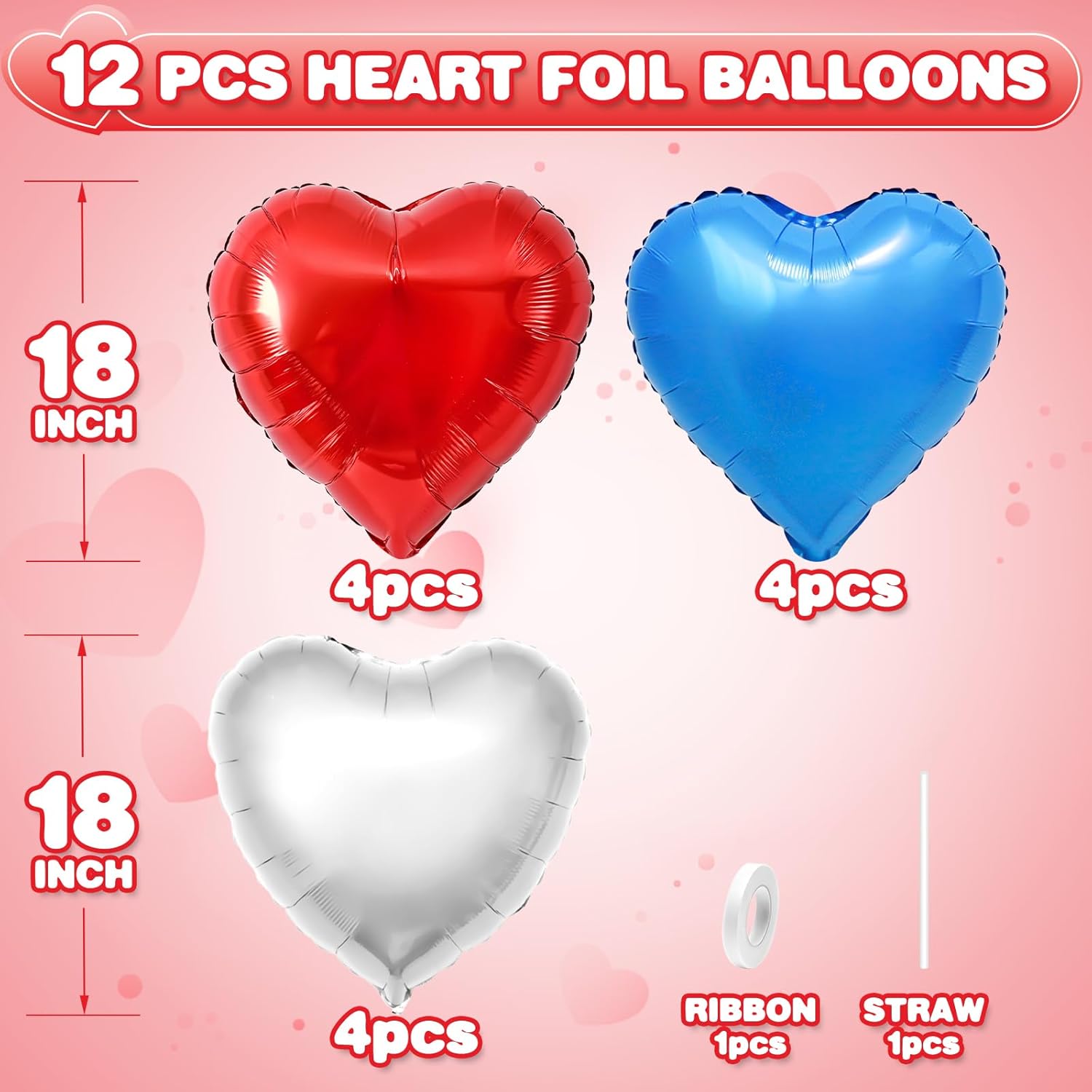- 12PCS HEART BALLOONS:Package include 4pcs blue heart foil balloons,4pcs red foil balloons,4pcs silver heart foil balloons,1pc straw.Large enough to help you better decorate your party.