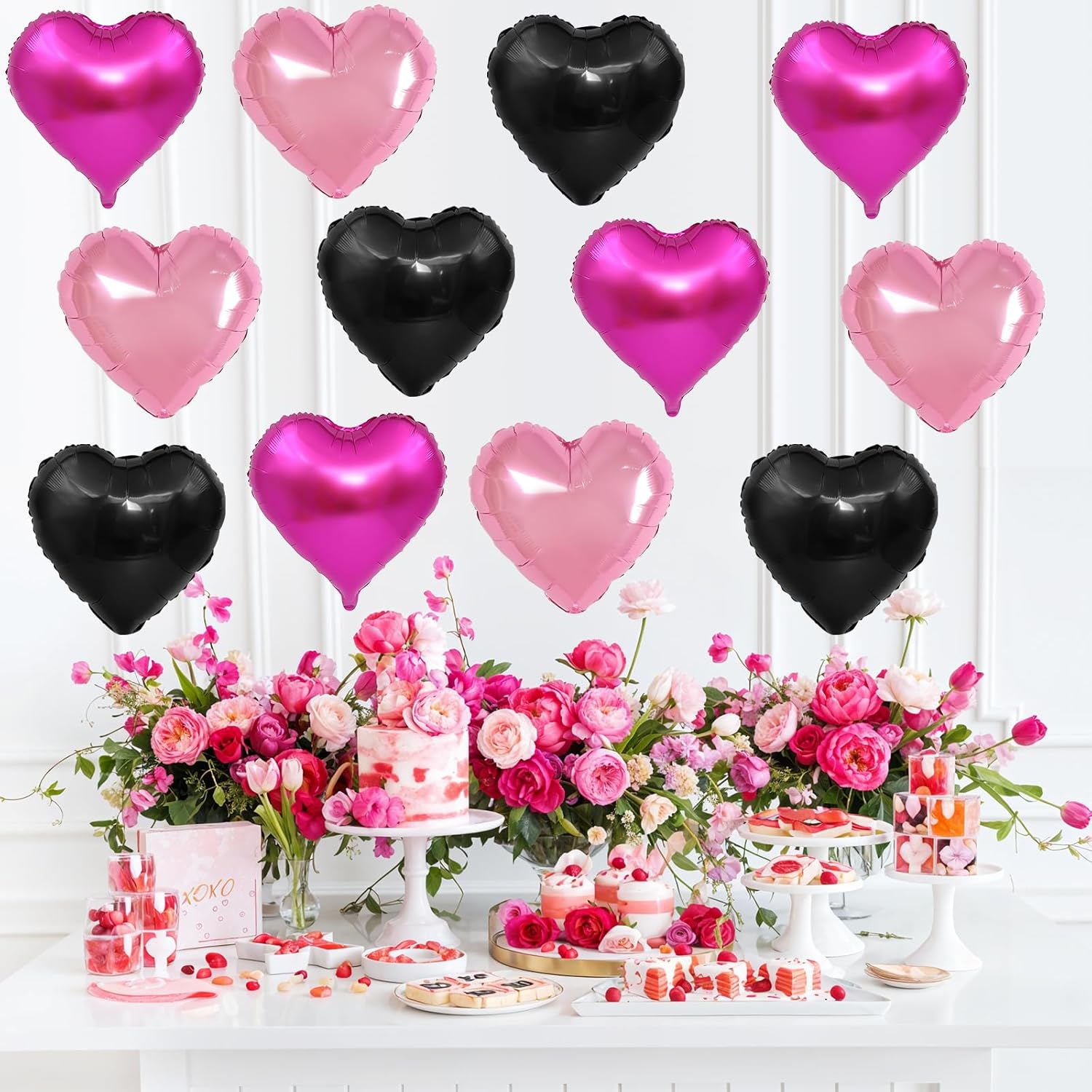 Pink Black Heart Balloons,12Pcs 18Inch Hot Pink Black Heart Shaped Foil Helium Balloons for Baby Shower Birthday Anniversary Wedding Engagement Party Decorations