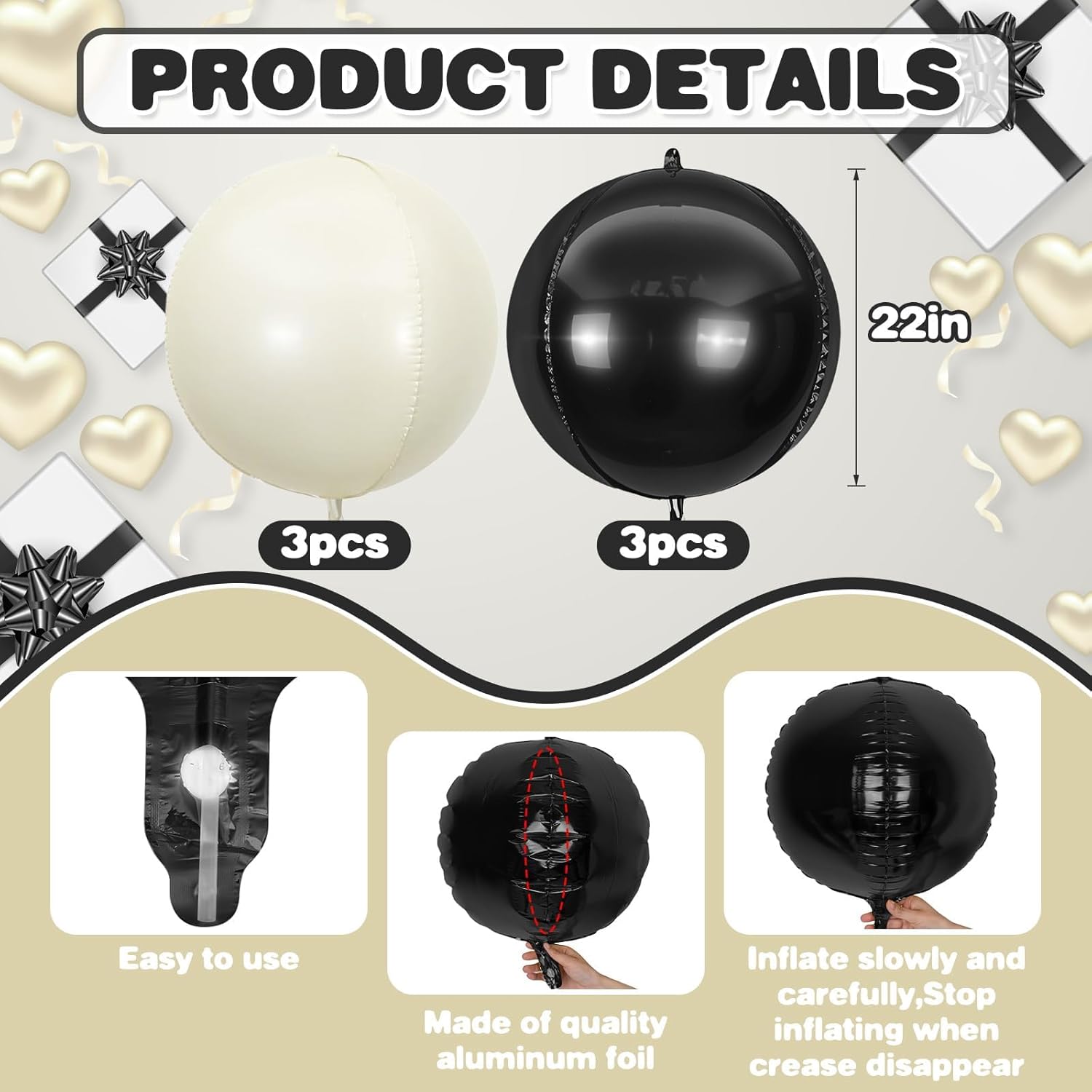 - 【6PCS ROUND BALLOONS】package include 6pcs 22inch Black White round giant 4D foil balloons. The Black White round balloons are large enough to help you better decorate your party.