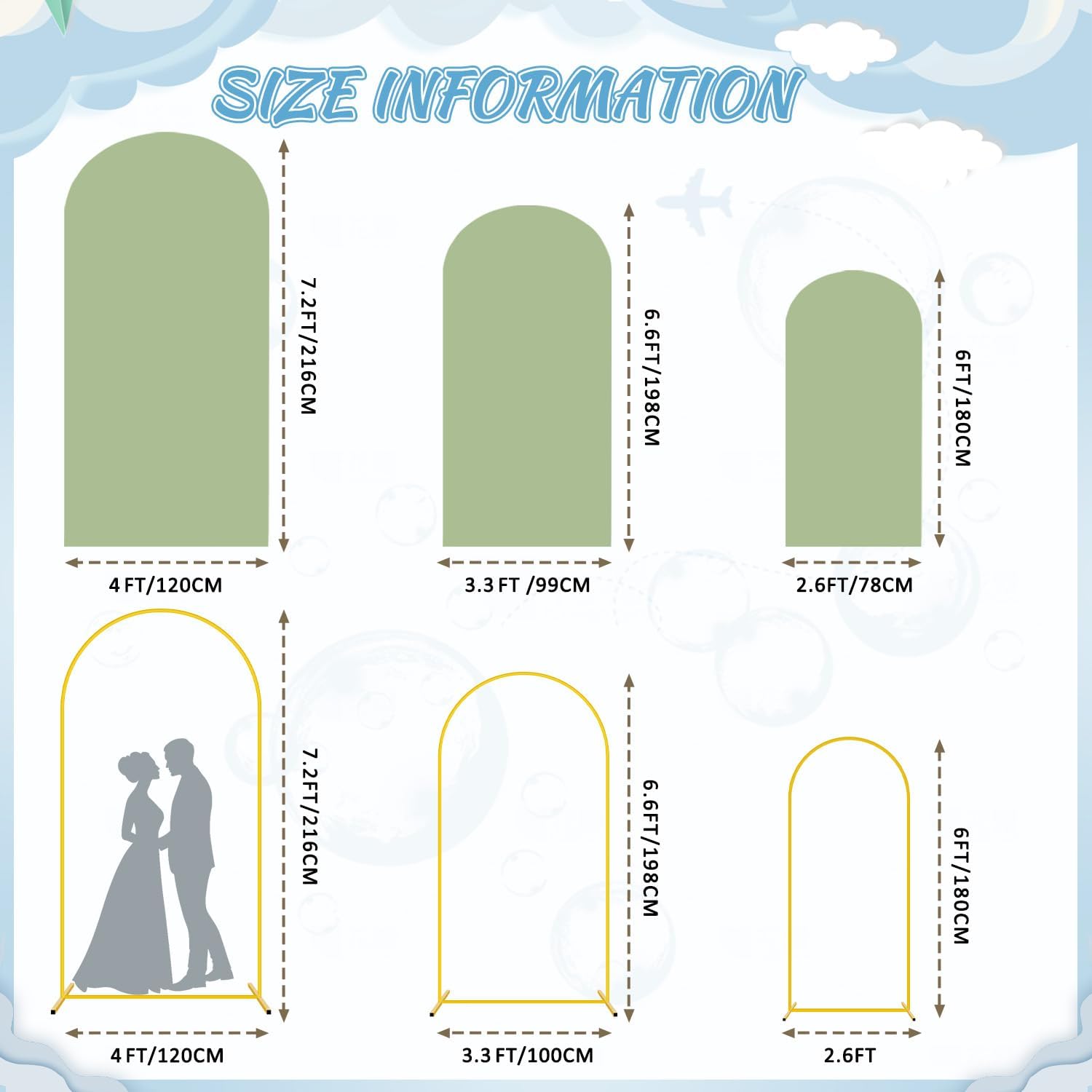 - đ§¸ăSize Information- Arch Backdrop Stand and Cover SetăArch stand and cover set includes 3 gold metal arch backdrop stands and 3 sage green arch cover in sizes 7.2FT x 4FT(H x W), 6.6FT x 3.3FT(H x W) and 6FT x 2.6FT(H x W). The backdrop arch stand with cover is certain to meet your decoration needs and add a charming look to your celebrations.