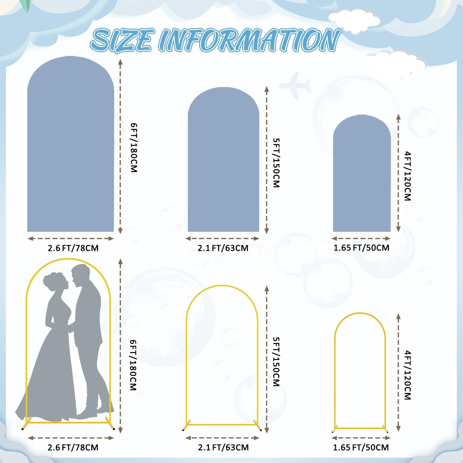 - đ§¸ăSize Information- Arch Backdrop Stand and Cover SetăArch stand and cover set includes 3 gold metal arch backdrop stands and 3 dusty blue arch cover in sizes 6FT x 2.6FT(H x W), 5FT x 2.1FT(H x W) and 4FT x 1.65FT(H x W). The backdrop arch stand with cover is certain to meet your decoration needs and add a charming look to your celebrations.