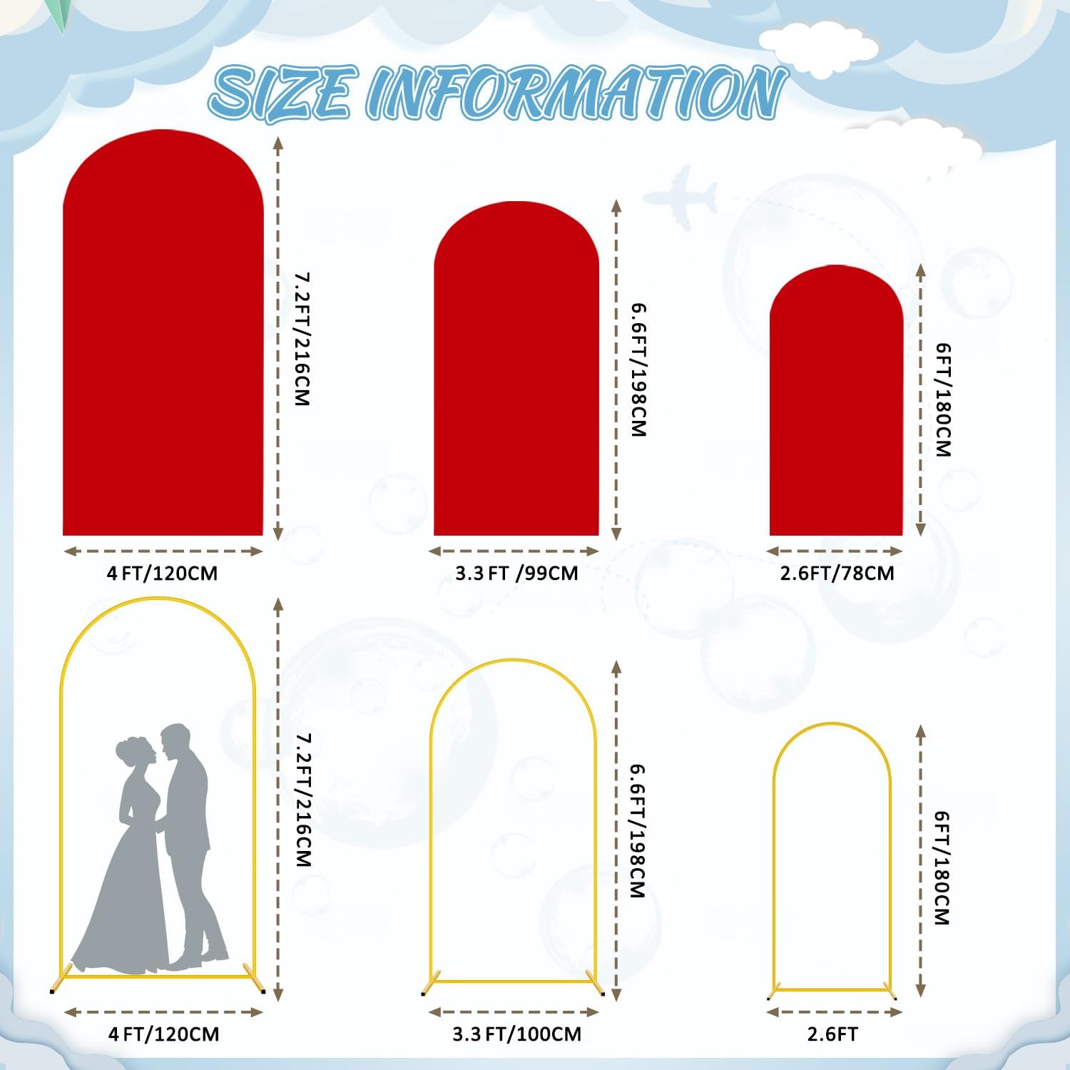 - đ§¸ăSize Information- Arch Stand and Cover SetăArch stand and cover set includes 3 gold metal arch backdrop stands and 3 red arch cover in sizes 7.2FT x 4FT(H x W), 6.6FT x 3.3FT(H x W) and 6FT x 2.6FT(H x W). The backdrop arch stand with cover is certain to meet your decoration needs and add a charming look to your celebrations.