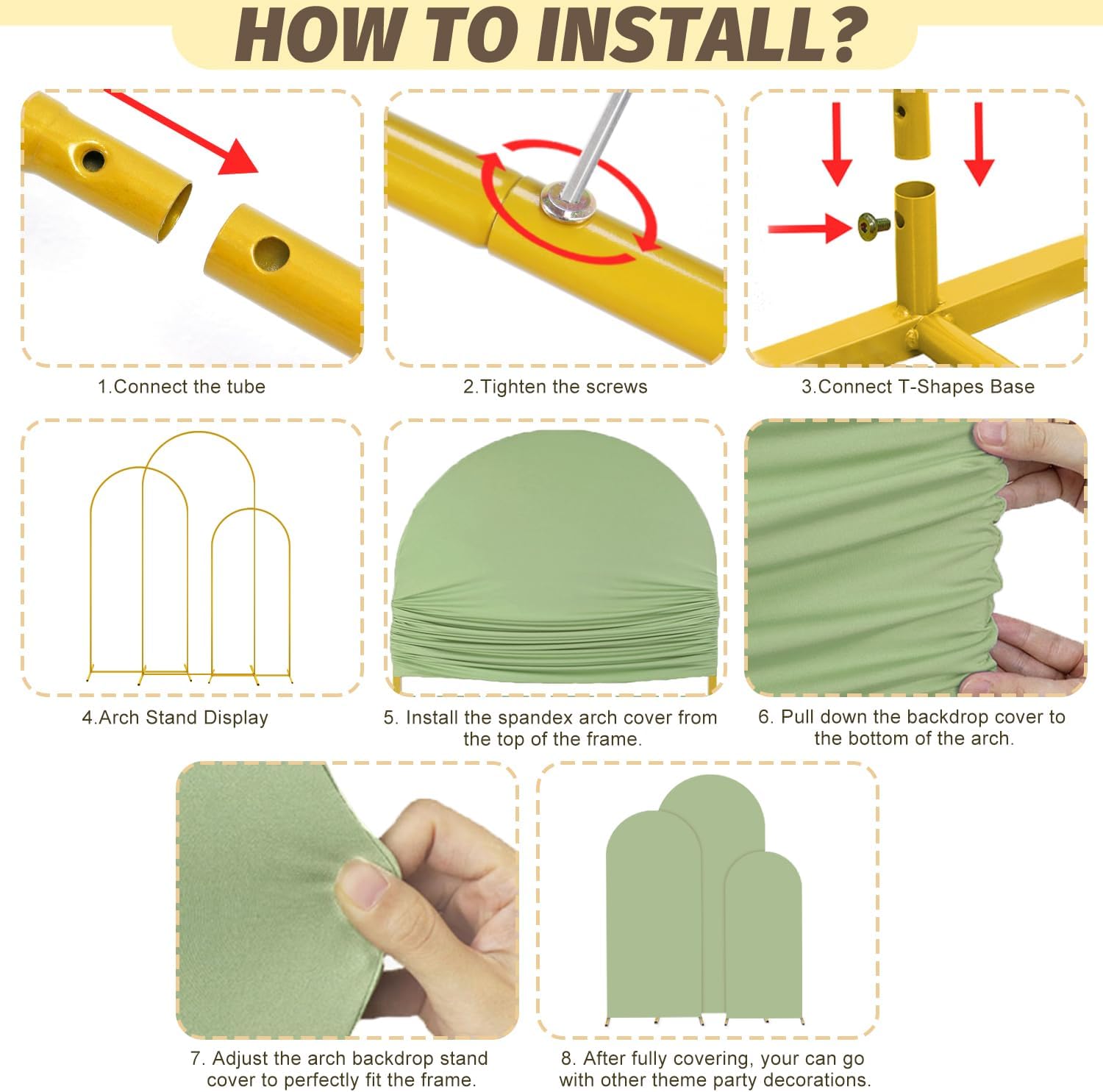 MODFUNS Arch Backdrop Stand and Cover Set Gold Wedding Arch Frame 4&5&6ft Sage Green Arches Backdrop Cover Set of 3 Metal Arched Stand with Covers for Party Baquet Reception Backdrop Decor