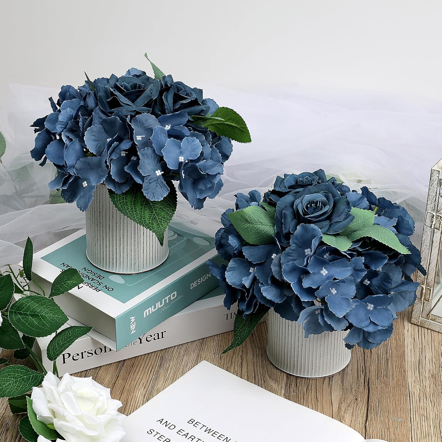 - Pack of 6 pre-made artificial flowers with rustic metal pot for table centerpieces. Consists of high quality deep dusty blue fake roses and faux hydrangeas.