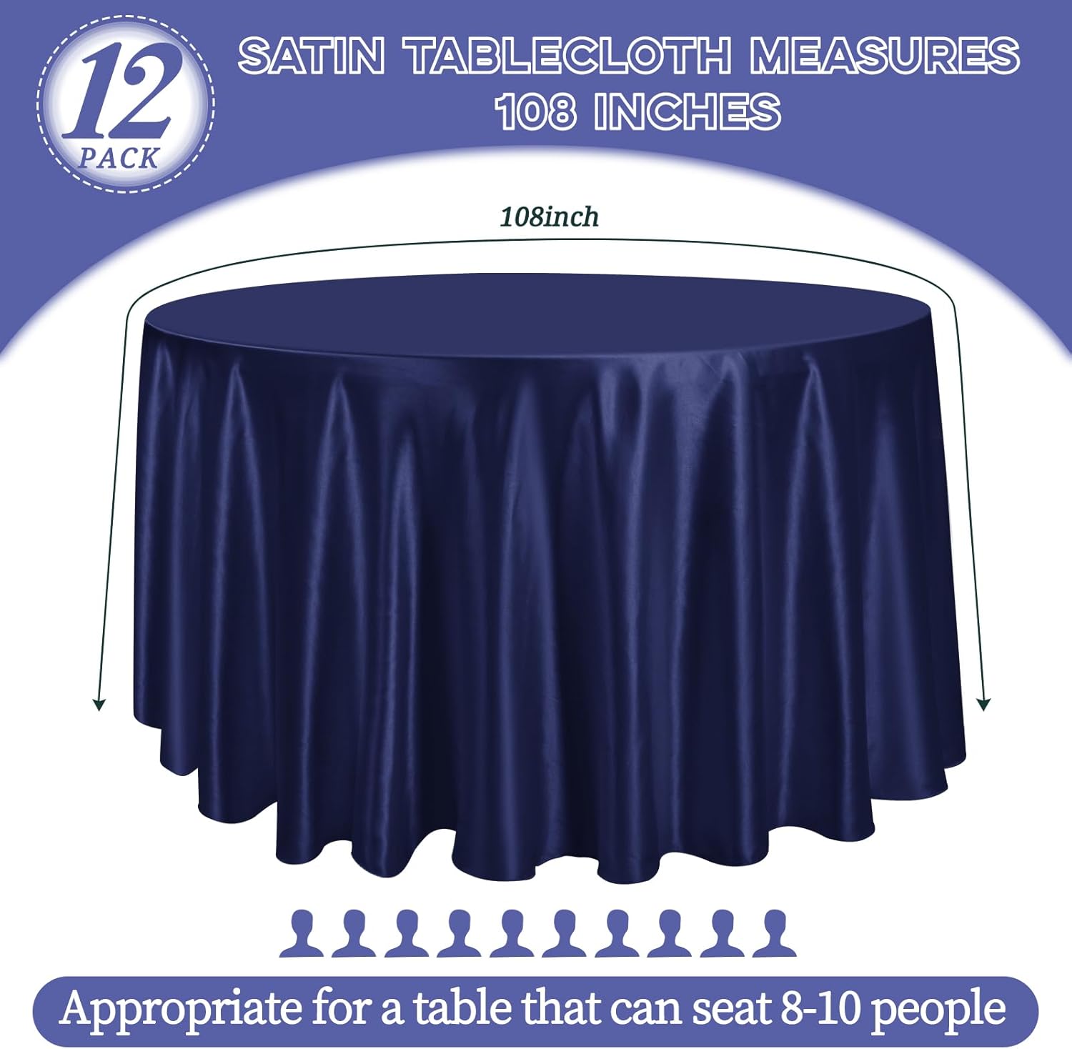 12 Pack 108 Inch Navy Blue Satin Tablecloth - Silky Round Tablecloth Overlay Smooth Fabric Table Cover, Bright Table Decoration for Wedding Party Banquet Events Restaurant Kitchen Dining