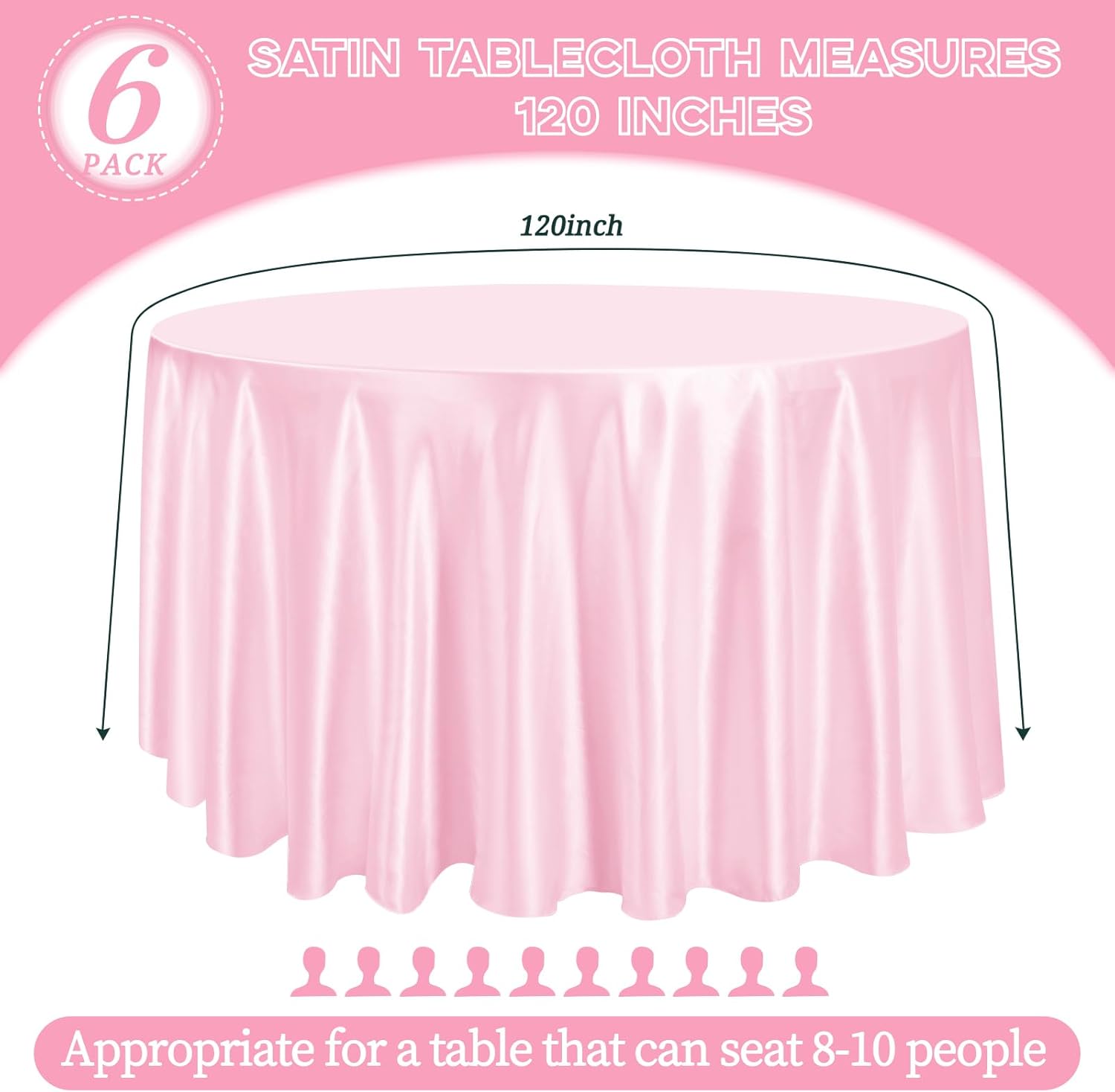 - 【Round Satin Tablecloths】6 Pieces premium light pink satin round tablecloth. The size of silk satin table cover is 120 inches, large enough to decorate a table that can accommodate 8-10 persons. It is suitable for most household round tables and can meet your different needs. Sufficient quantities are sufficient for party decoration. The tablecloth size is usually larger than your table size. Please measure your table size before buying.