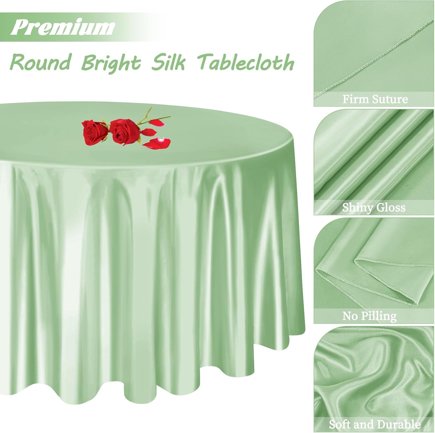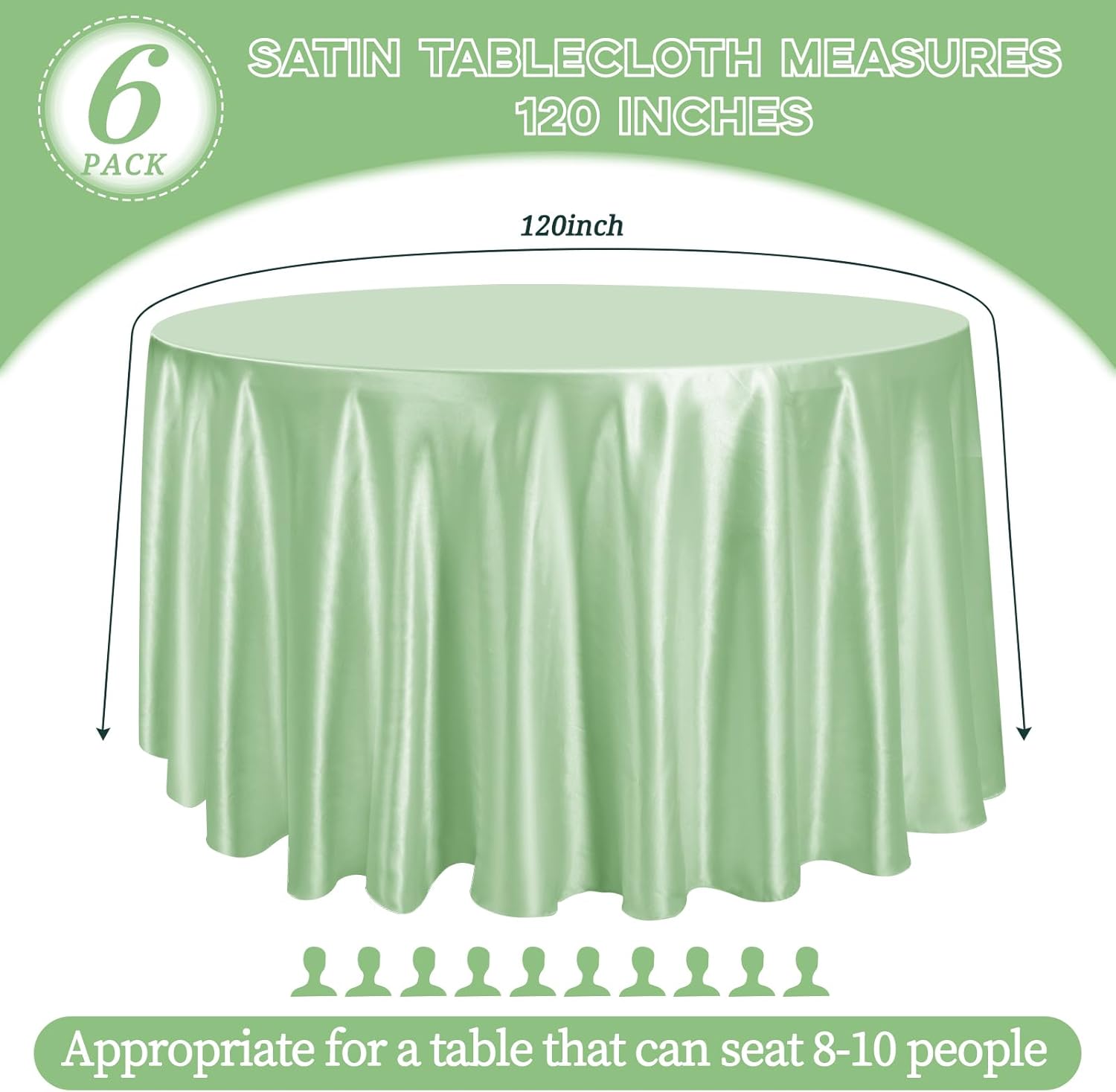 - 【Round Satin Tablecloths】6 Pieces premium sage green satin round tablecloth. The size of silk satin table cover is 120 inches, large enough to decorate a table that can accommodate 8-10 persons. It is suitable for most household round tables and can meet your different needs. Sufficient quantities are sufficient for party decoration. The tablecloth size is usually larger than your table size. Please measure your table size before buying.
