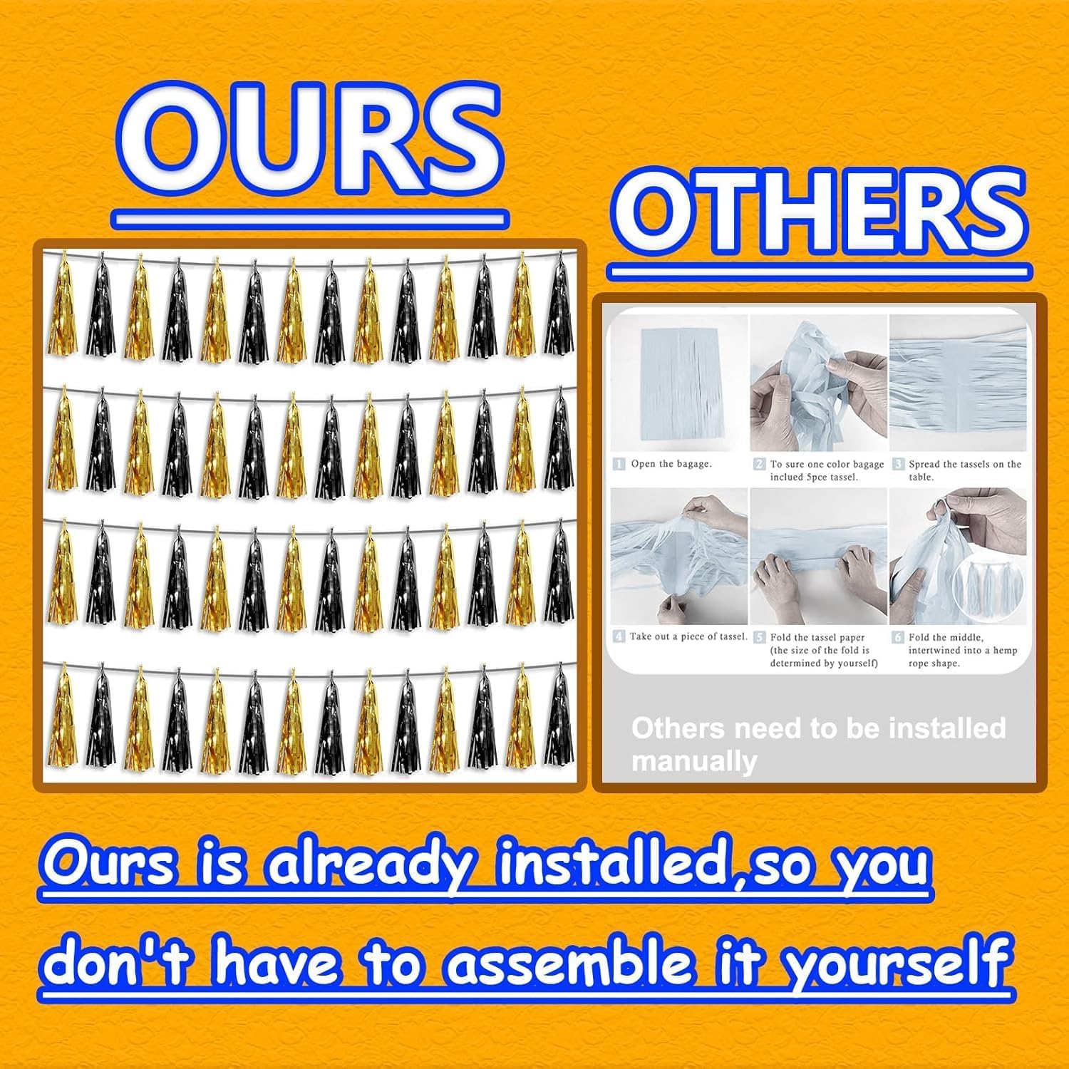 - 【Package Includes】The total length of the black gold birthday tassels banner is 40 feet, divided into 4 strips, each 10 feet long. Each banner contains 15 tassels, and each tassel measures 14 inches, for birthday decorations many occasions uitable for Patriotic display, Homecoming Float, Christmas Float, ecorative metal trailers, graduation floats etc