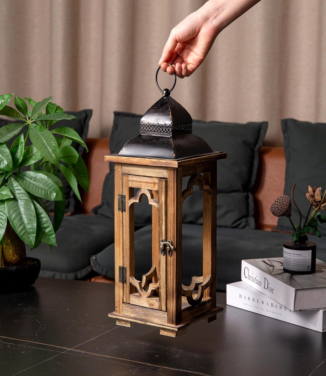 - MEASUREMENT - This vintage wooden lantern set come in 2 different sizes. L: 9.25ββL x 9.25ββ W x 24ββH, S: 6.5ββL x 6.5ββW x 15ββH (Candles not included). They offer a eye-catching presence in any space.