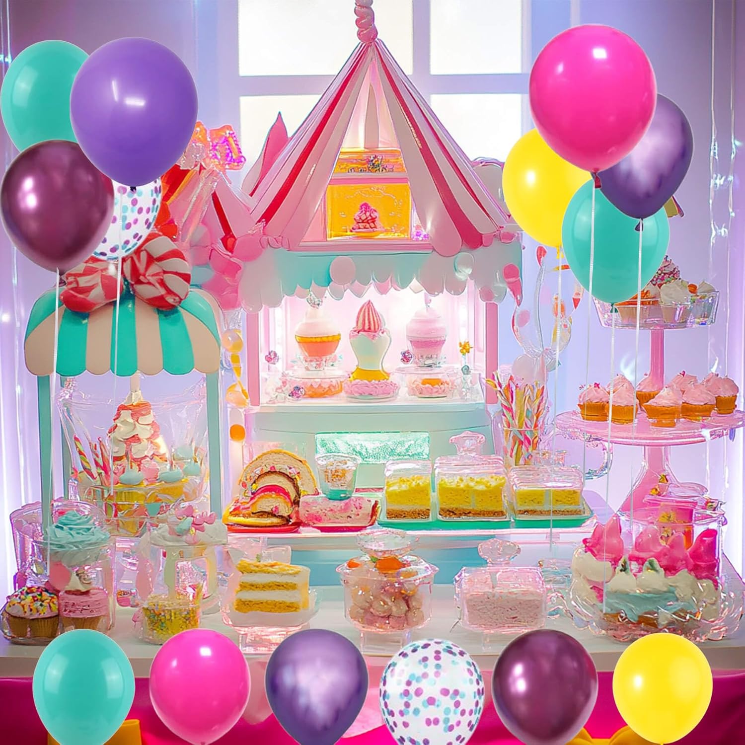- 7 COLORS LATEX BALLOON: Teal blue balloons, hot pink balloons, metallic hot pink balloons, metallic purple balloons, purple balloons, yellow balloons, confetti balloons;