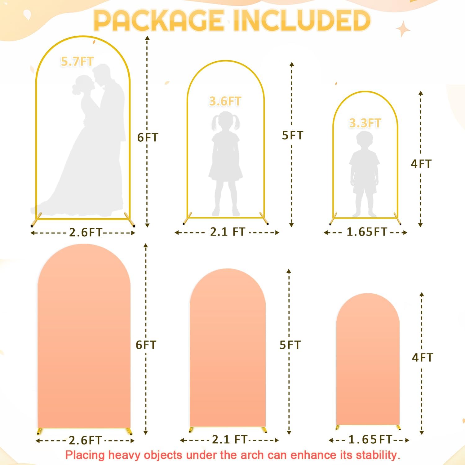 - đ„ăPackage Included - Metal Arch Backdrop StandăYou will receive 3 gold metal arch backdrop stand and 3 peach arch cover. Size: Size: 6ft H x 2.6ft W, 5ft H x 2.1ft W, 4ft H x 1.65ft W. Let's create unforgettable moments with our arch backdrop stand cover!