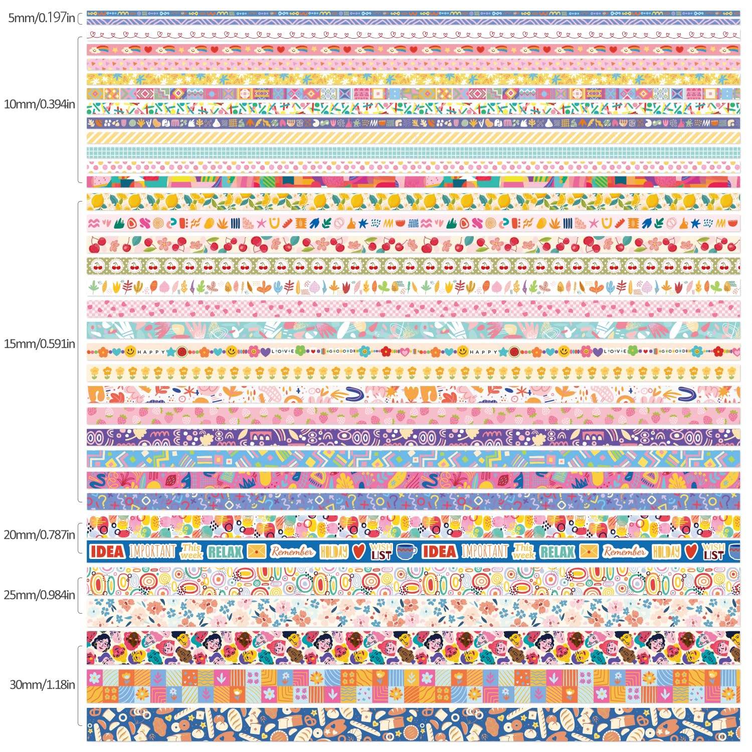 - 35 Rolls Washi Tape,1.18 inch (30mm) wide x 3 tapes; 0.98 inch (25mm) wide x 2 tape; 0.79 inch (20mm) wide x 2 tape; 0.59 inch (15mm) wide x 15 tapes; 0.39 inch (10mm) wide x 11 tapes; 0.19 inch (5mm) wide x2 tapes. These different series and sufficient quantity washi paper stickers can meet your use and replacement.