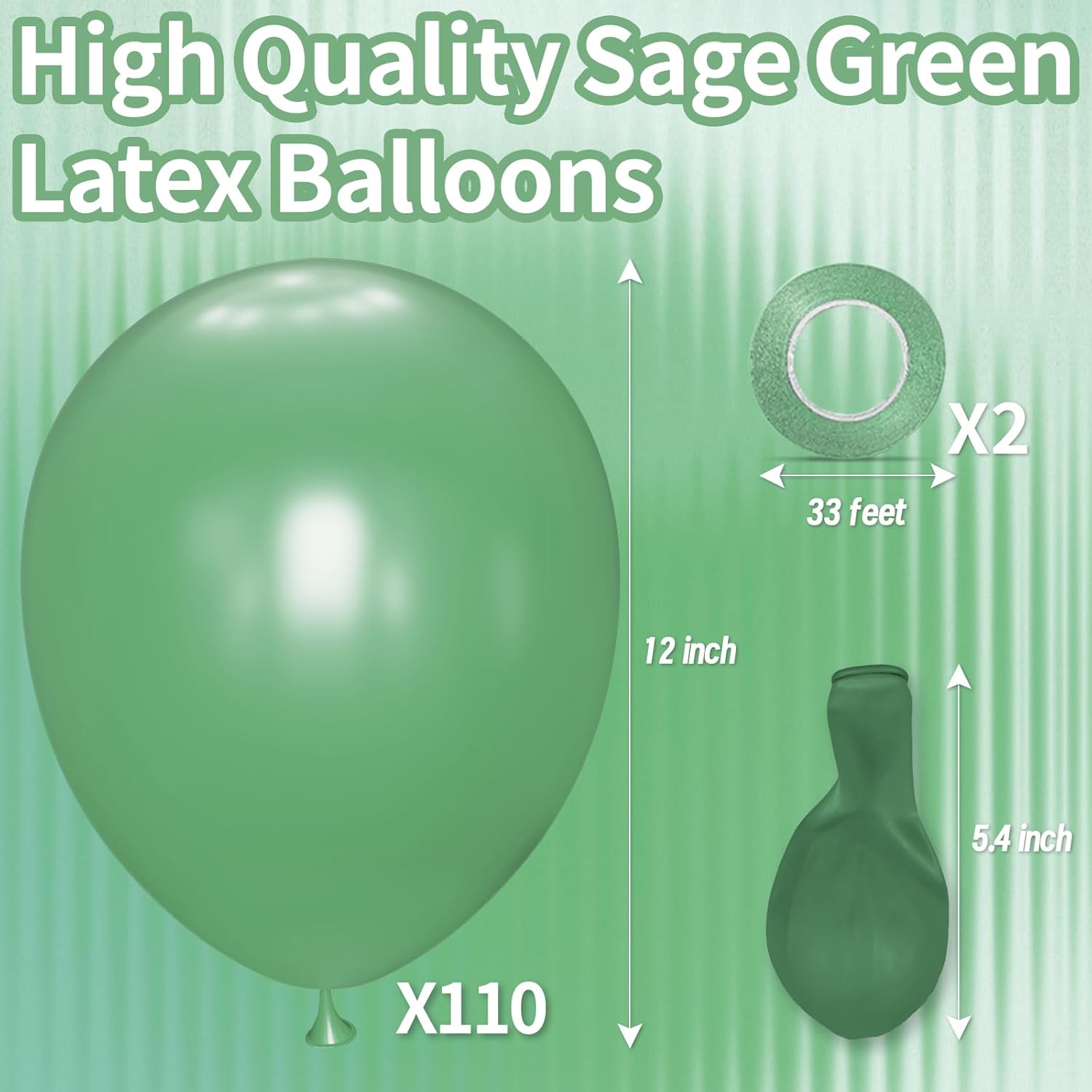 - 110-Count 12" Sage Green Latex Balloons: Premium bulk pack of 110 muted 12-inch balloons—perfect for earthy weddings, wellness retreats, or eco-conscious brand events with calming, nature-inspired elegance.