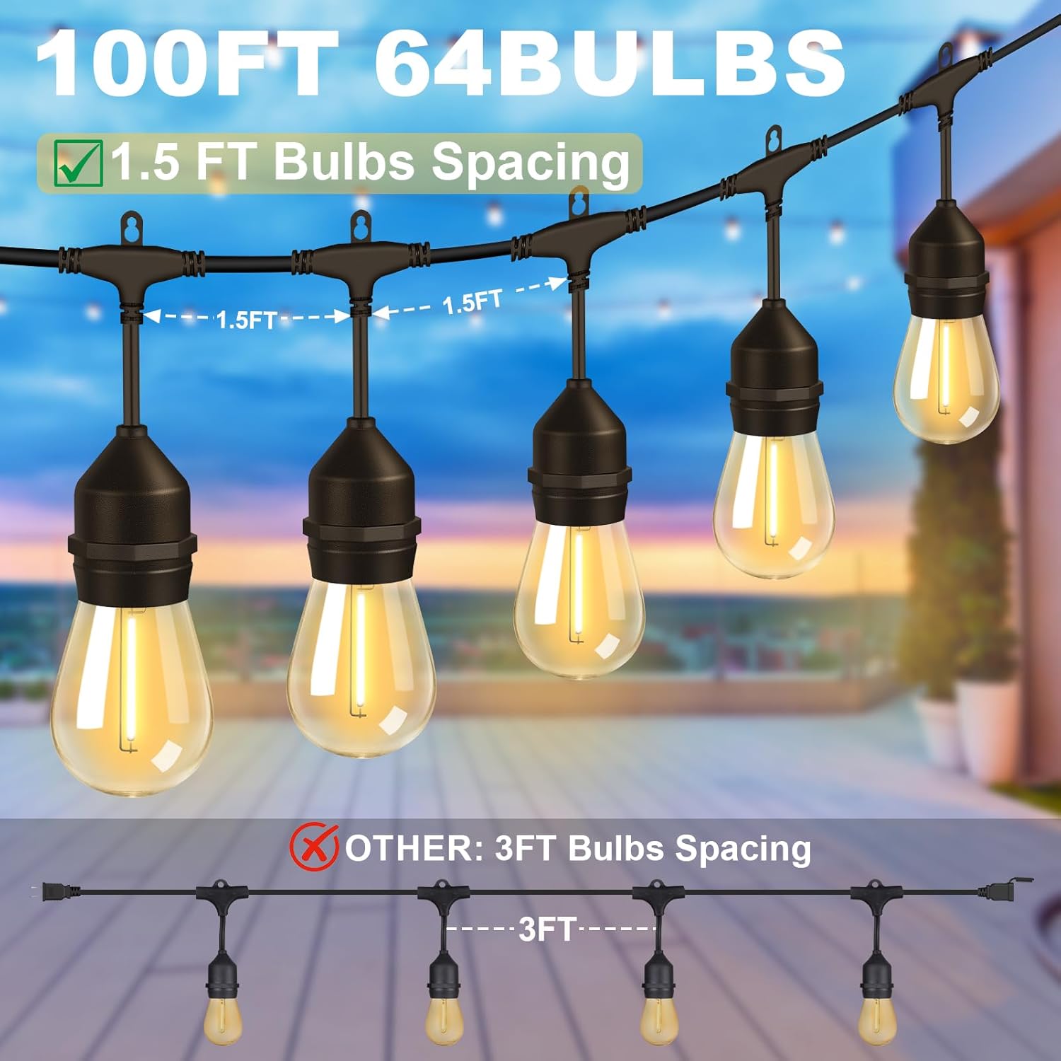100FT Outdoor String Lights with 64+4 Bulbs (1.5FT Bulbs Spacing), Remote & Dimmer, Commercial Patio String Lights with 3 Mode Light & Timing, IP65 Waterproof, 100PC Mounting Ties for Outside
