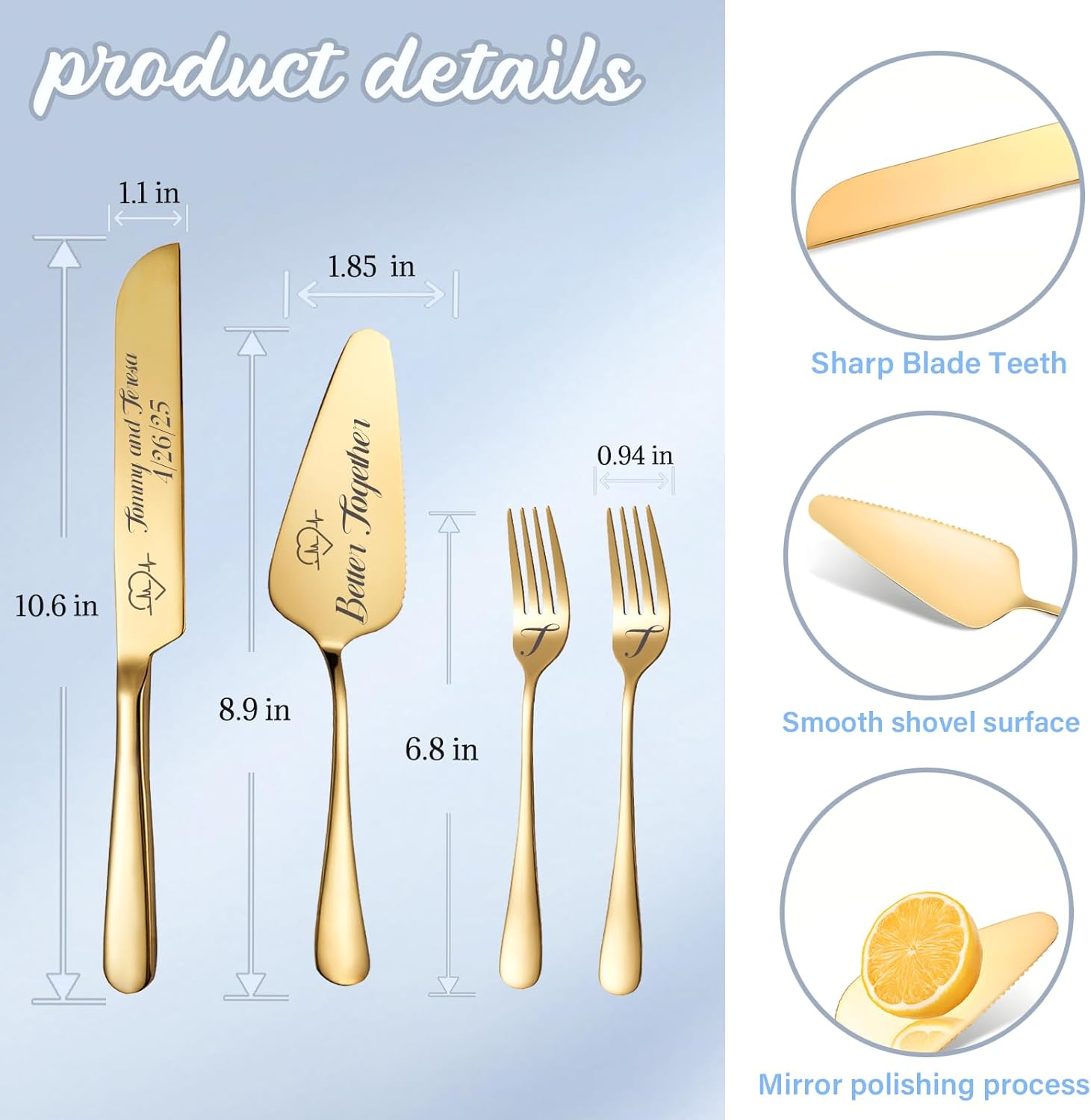 Personalized Wedding Cake Knife and Server Set, Custom Names Cake Cutting Set with Stainless Steel Forks, Customized Bridal Anniversary Birthday Wedding Registry Gifts (Gold)
