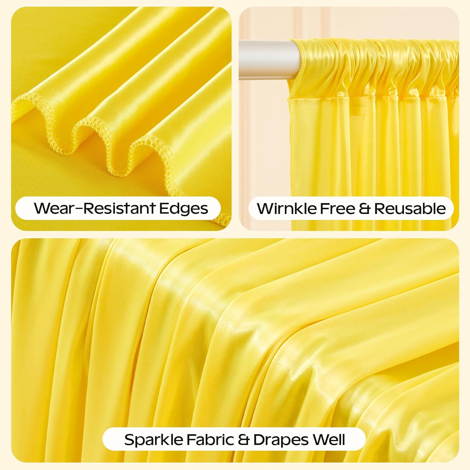 - Easy Care & Reusable Gold Glitter Drapes for Backdrop:We recommend you could clean the gold photo backdrop with hands.Or you could put the satin glitter backdrop drapes in a laundry bag and then use the washing machine to wash it.We recommend cleaning and storing it after used, you can use it again when needed next time.