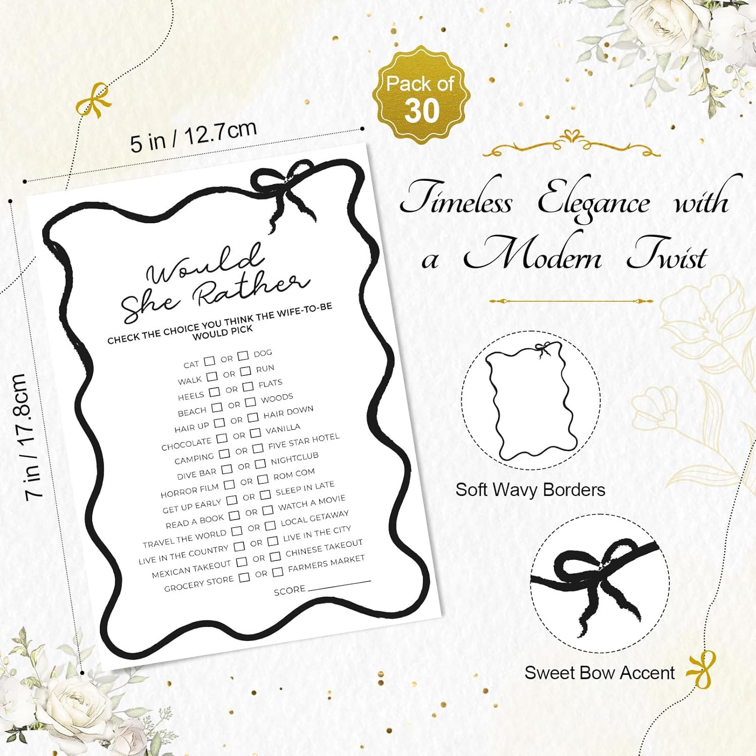 DEEKA 30 PCS Bridal Shower Games Card for 30 Guests Black Wavy Border Ribbon Bow Funny Wedding Bachelorette Party Games for Reception (Would She Rather)