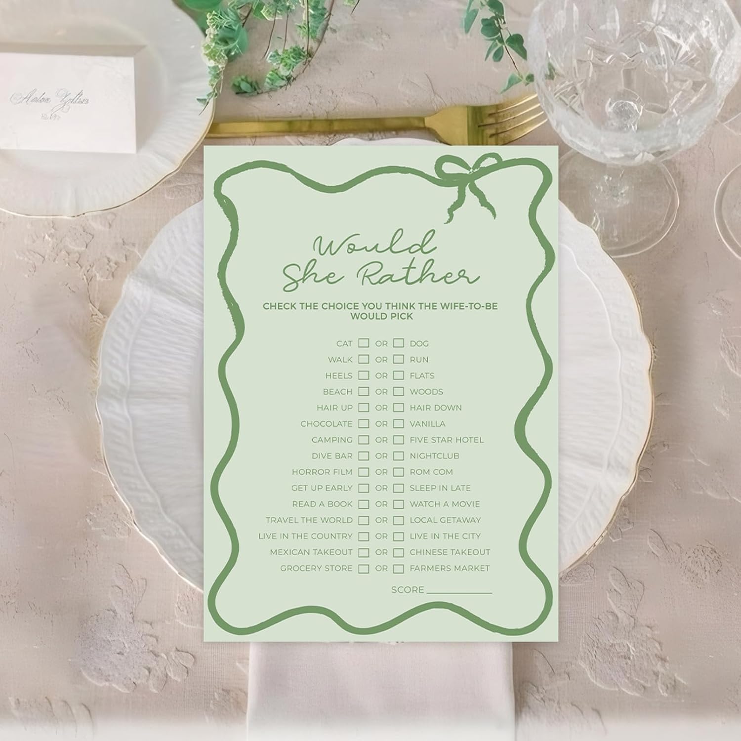 DEEKA 30 PCS Bridal Shower Games Card for 30 Guests Sage Green Wavy Border Ribbon Bow Funny Wedding Bachelorette Party Games for Reception (Would She Rather)