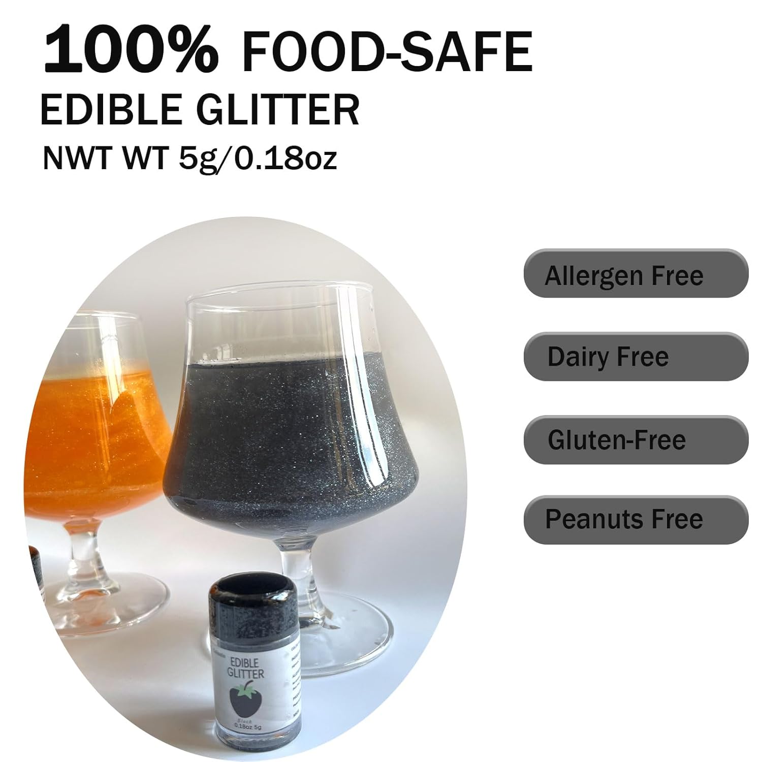 - Made of Premium Food Grade Material - 100% MSDS-certified food ingredients! Black edible Glitter for Drinks,Made of food grade mica powder imported from Germany and food coloring, no sugar or spices are added. Dairy-free, Gluten-free, Vegan Friendly, adults or kids can be safe to use.