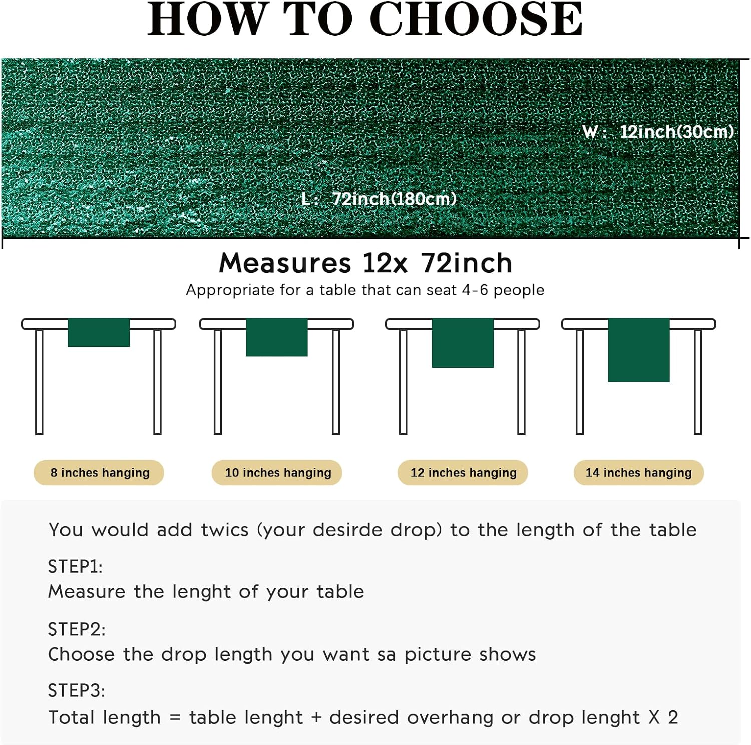 - Package Include: Each sequin table runner measures 12" x 72", total 2 pieces, perfect for a table that seat 4-6 people. The sequin table runner is appropriate for rectangle or round tables.