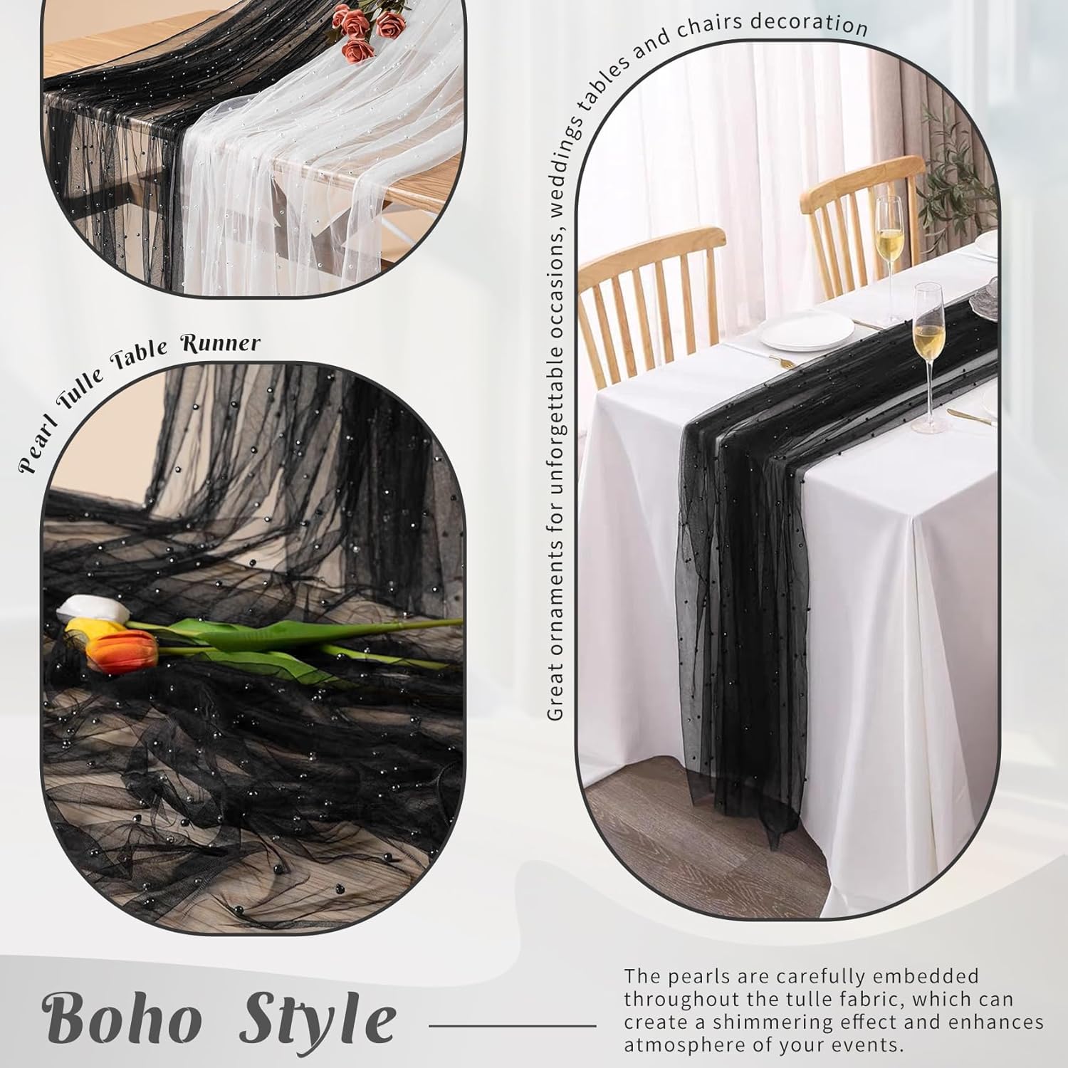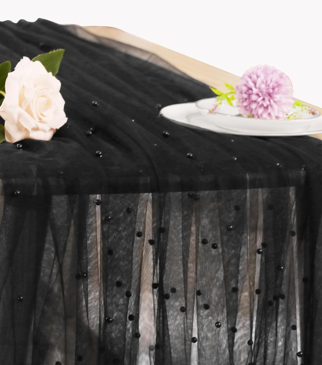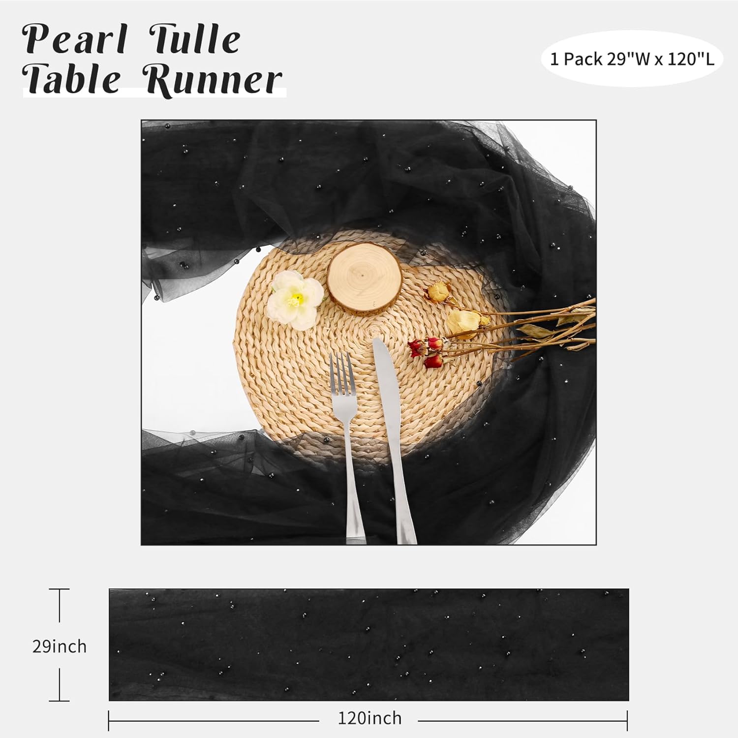 Pearl Table Runner 29 x 120 Inch Tulle Fabric Lace Table Runners Boho Rustic Tablecloth for Bridal Shower Birthday Party Wedding Arch Aisle Veil Dessert Table Decor(1 Pack, Black)