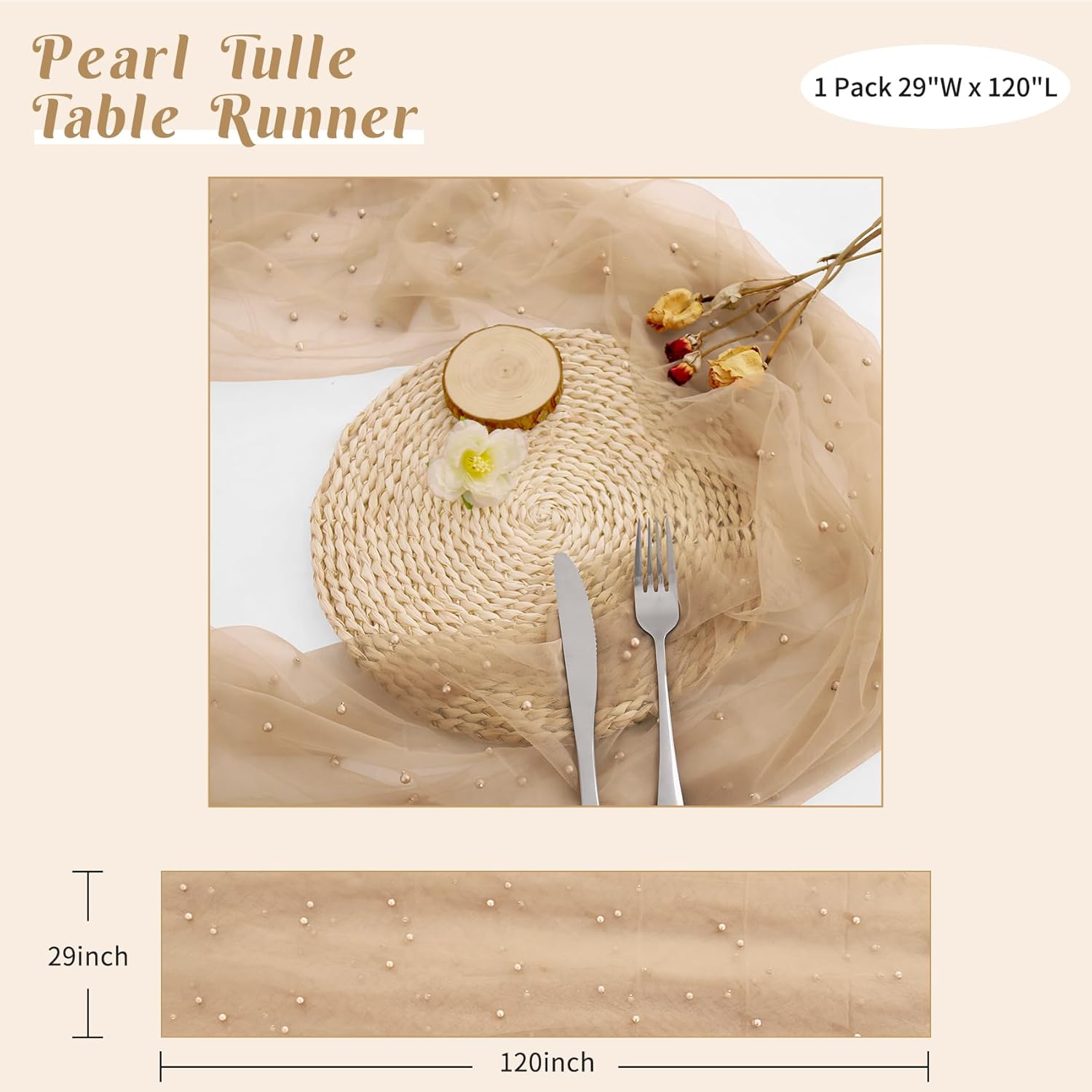 - 【Package Include】 You will receive 1 piece of 29 x 120 inches pearl tulle table runners. The pearls delicately added give this an elegance to elevate table decor, it's long enough to fit different size tables and chairs, These tulle table runner with pearls are skin-friendly. There are lots of different colors for you to choose. Perfect to decorate your tables.