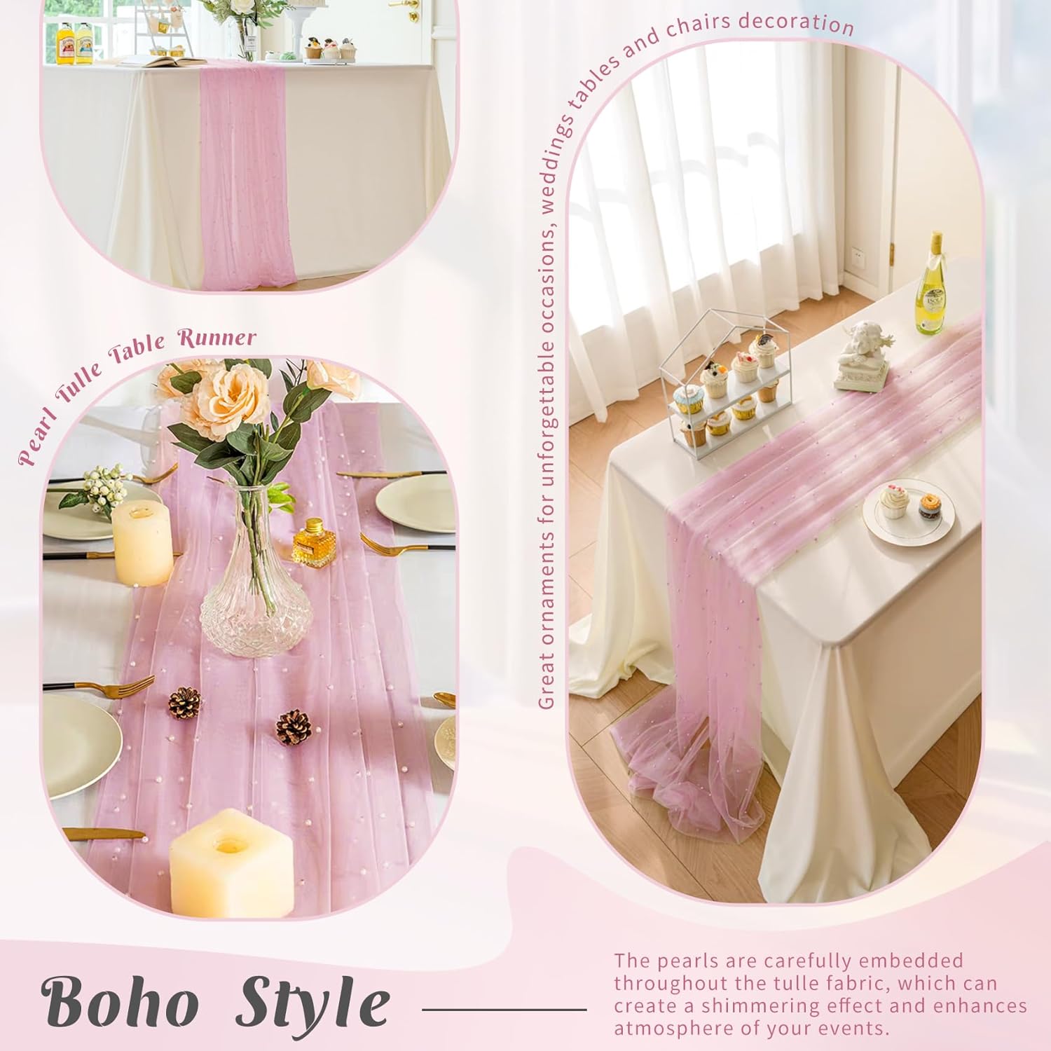 Pearl Table Runner 29 x 120 Inch Tulle Fabric Lace Table Runners Boho Rustic Tablecloth for Bridal Shower Birthday Party Wedding Arch Aisle Veil Dessert Table Decor(1 Pack, Pink)