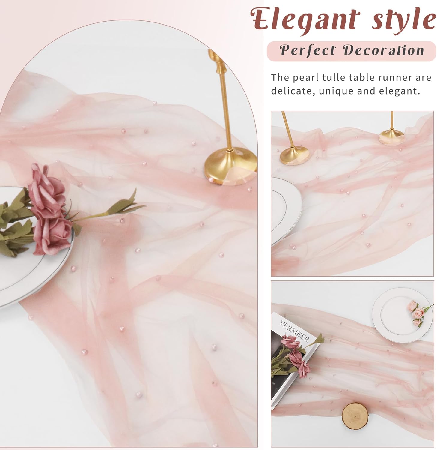 Pearl Table Runner 29 x 120 Inch Tulle Fabric Lace Table Runners Boho Rustic Tablecloth for Bridal Shower Birthday Party Wedding Arch Aisle Veil Dessert Table Decor(1 Pack, Dusty Pink)
