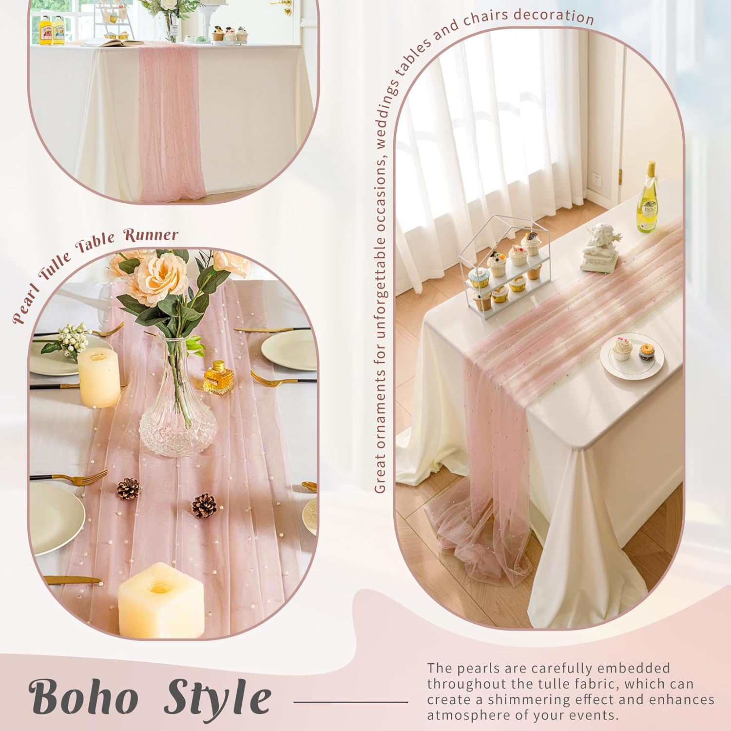 - 【Package Include】 You will receive 1 piece of 29 x 120 inches pearl tulle table runners. The pearls delicately added give this an elegance to elevate table decor, it's long enough to fit different size tables and chairs, These tulle table runner with pearls are skin-friendly. There are lots of different colors for you to choose. Perfect to decorate your tables.