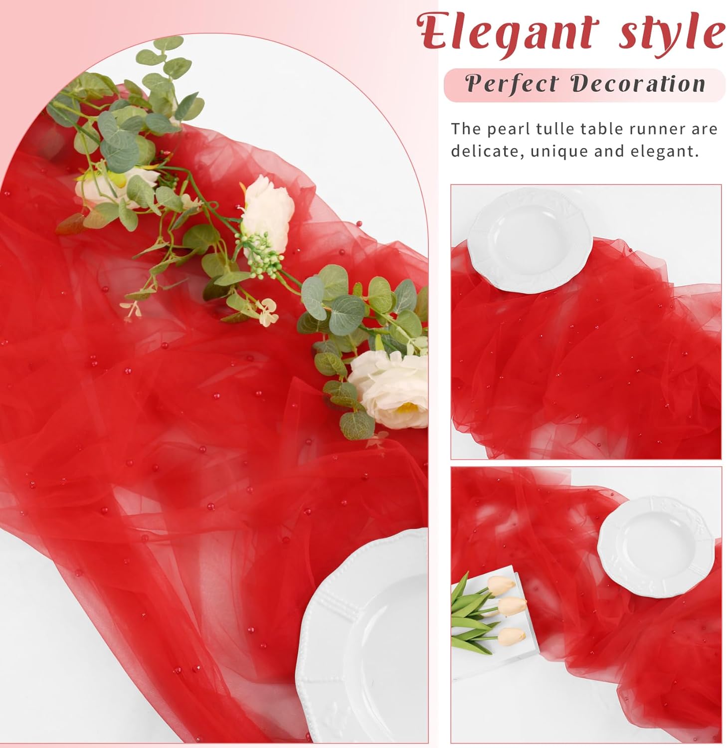 - 【Exquisite Workmanship】 These romantic table runners are made of premium tulle. Soft feeling, sheer, reusable, easy to clean and fade resistant. Delicate pearls embellished table runner works perfectly for many types of event decor, which will add a ton of elegance to any space.