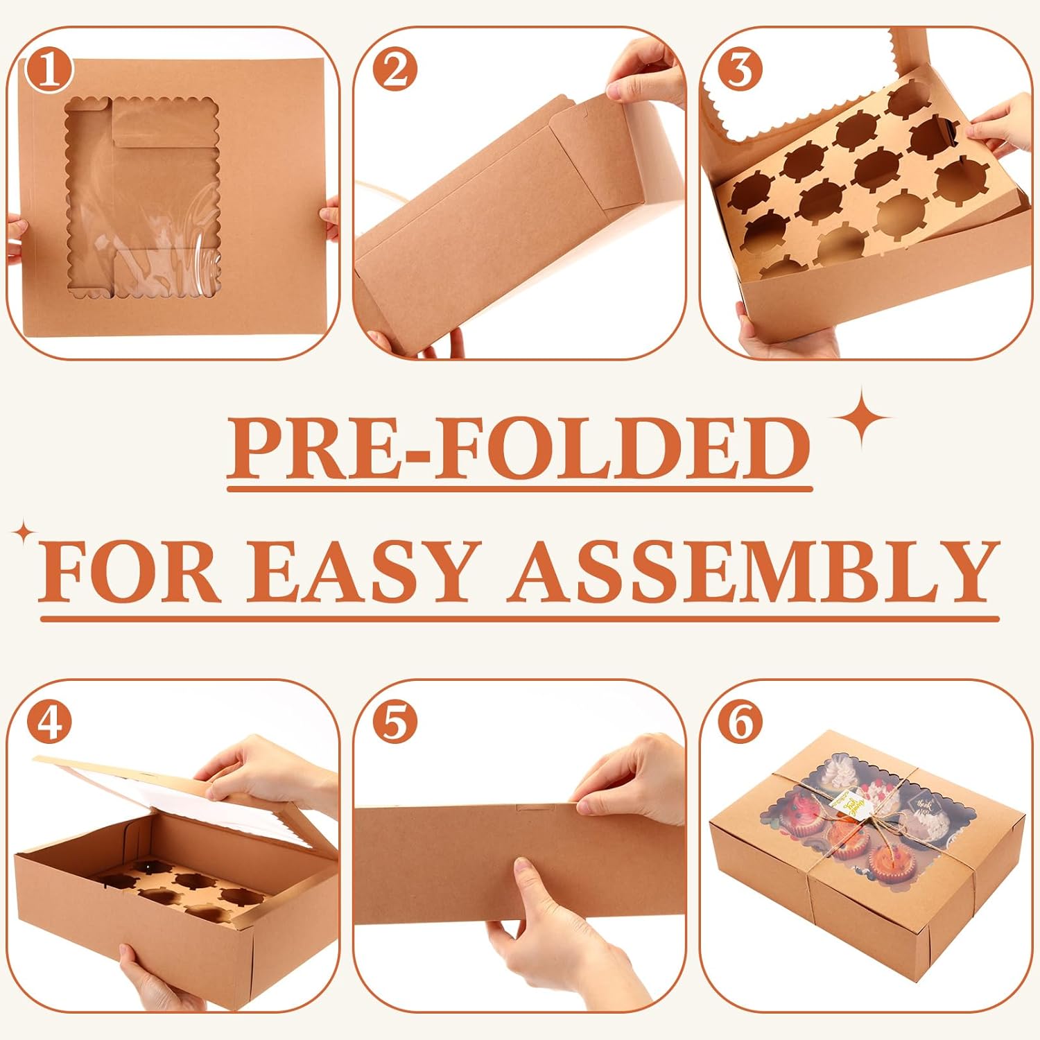 - Value Cupcake Boxes: you will receive 36 nature cupcake boxes with windows and inserts; Each cupcake holder can hold 12 standard cupcakes, and comes with 8 jute ropes totaling 80 meters (8 rolls X 10 meters) and 36 "Thank You" cards, which can ideal display your baking works and gift-giving needs