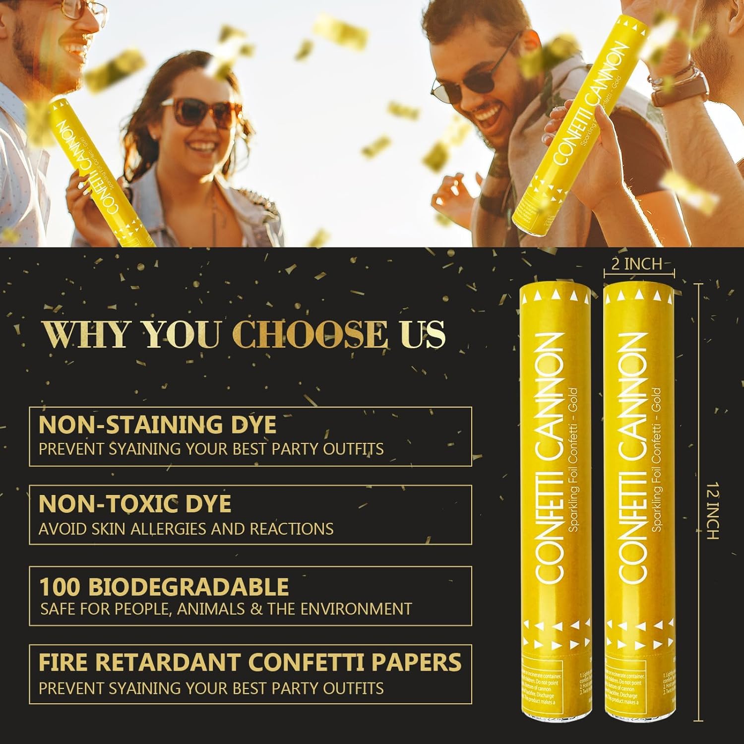 - CONFETTI CANNON 12 PACK - Each Confetti cannon gold come with 12 pack confetti poppers, Simply twist of the bottom confetti poppers spray out shiny gold confetti. Great results ensure you stand out at any event, dazzling confetti spray in bring the atmosphere to a climax in the sky !