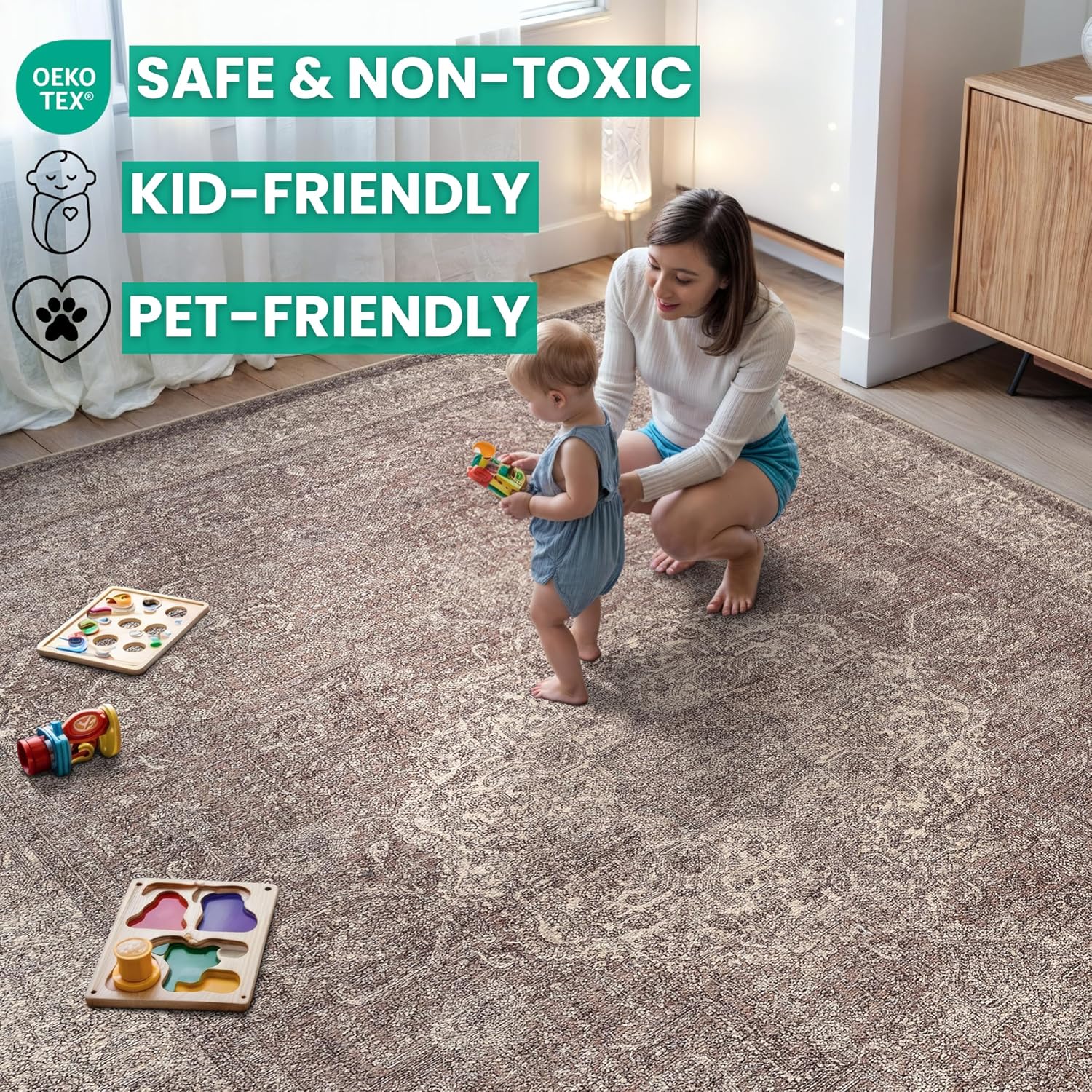 - MACHINE WASHABLE: Machine wash on delicate cycle (do not use bleach) at 85°F (30°C) and line dry or dry on air-only cycle without heat. Vacuum regularly and spot clean small stains. This easy to clean rug is perfect for families with kids and pets, and for high traffic areas.